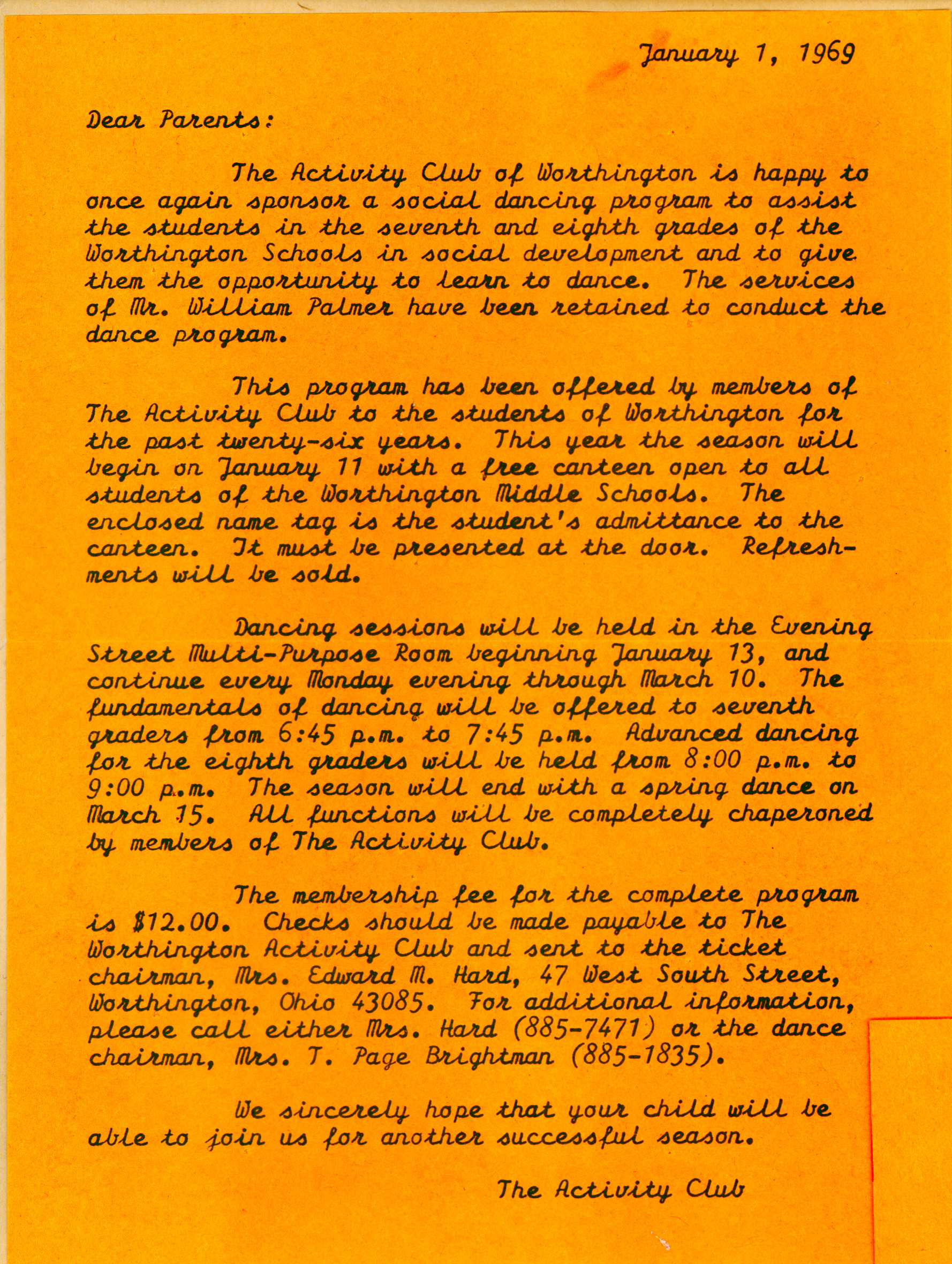 The Activity Club was founded in 1937 as the Personality Club by Mrs. Miriam Mackay, who saw a great need to form an organization dedicated to assisting youth with their social and personal problems. The club was originally formed with sponsorship by the Worthington P.T.A. Among the first activities of the group was the remodeling of formals for girls who were in need of them. Guidance concerning proper dress, manners and hostess etiquette were in demand. Although the club's focus was initially on girls, boys soon became interested and were also included in the programs. Over the years interests broadened, and the group was reorganized as the Activity Club. Social dancing classes for students from grade 4 to 12 became a major activity of the club during the 1940s and 1950s. Interest in dancing declined during the 1960s. Following a brief renewal of interest in dancing in the late 1970s, the emphasis on dance programs was discontinued.