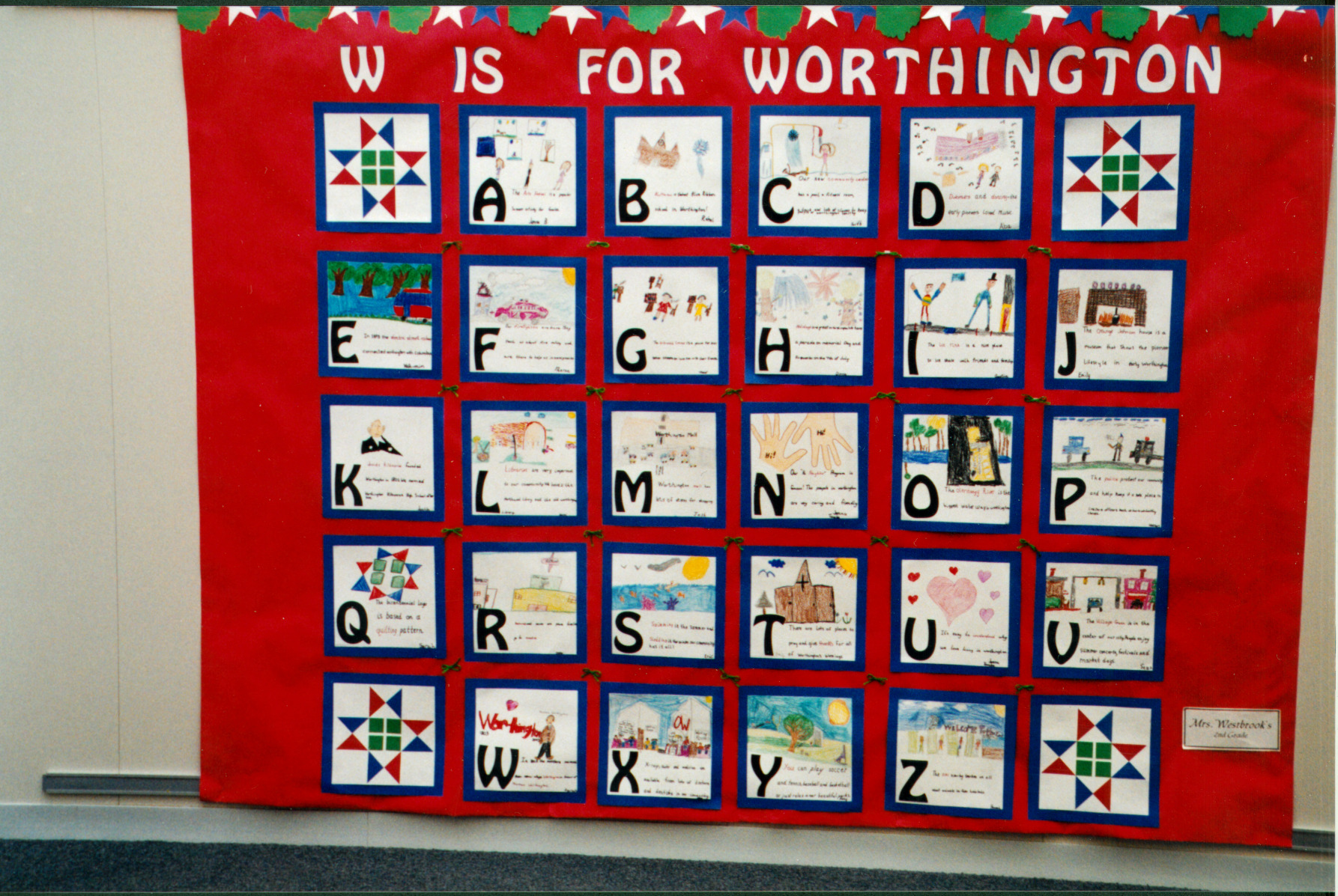 Second graders at Bluffsview Elementary School created this wall display "W is for Worthington." An aspect of Worthington is represented by each letter of the alphabet and accompanied by a drawing and description. The students' work was showcased during Bluffsview's Bicentennial Arts Open House May 1, 2003.
