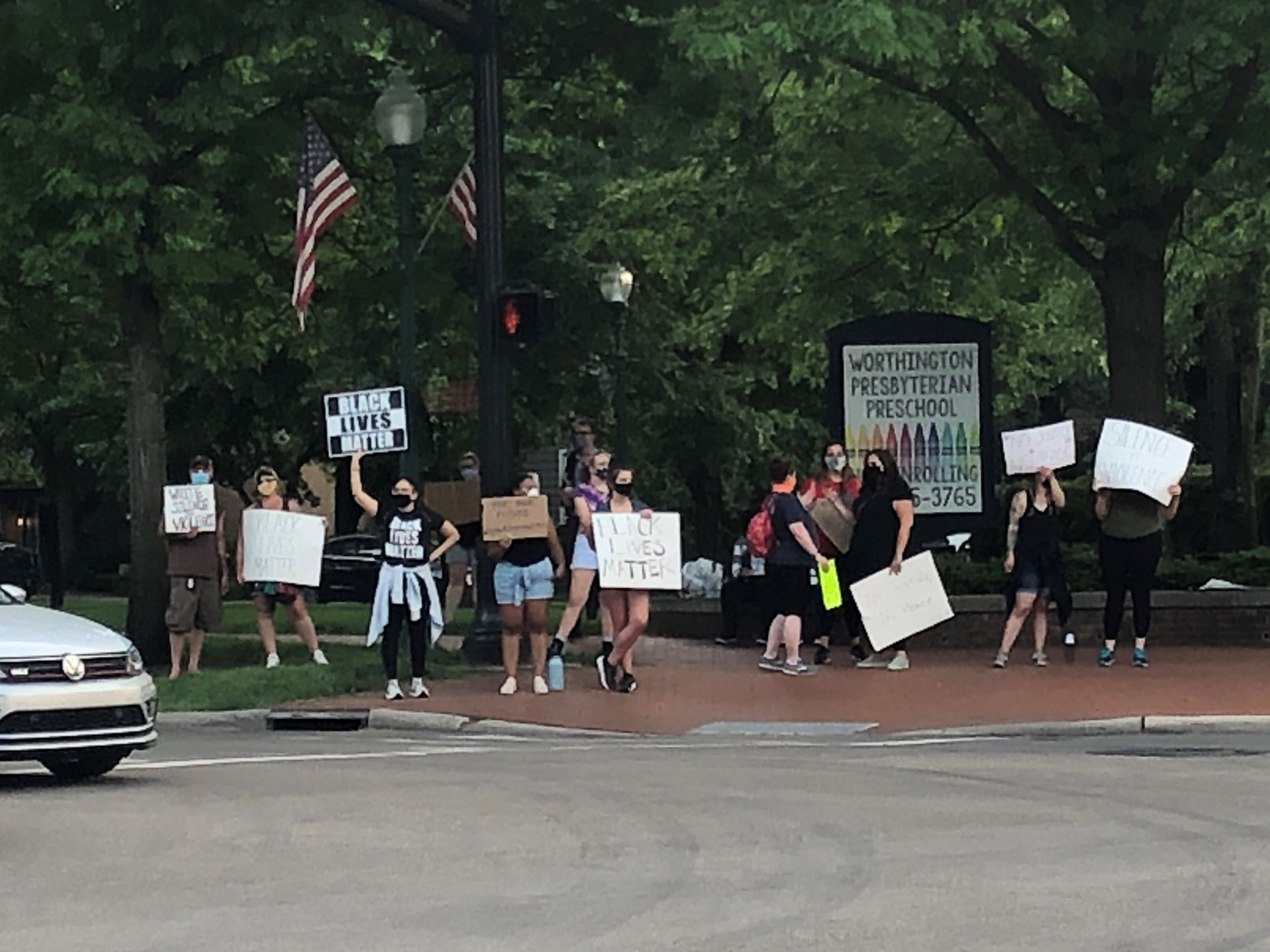 This photograph shows participants in a Black Lives Matter protest on the southwest corner of 161 and High Street in Worthington. Participants hold signs stating "Black Lives Matter" and "Silence is Violence." Passing cars honked to show their support. Protestors wore masks due to the ongoing COVID-19 pandemic.