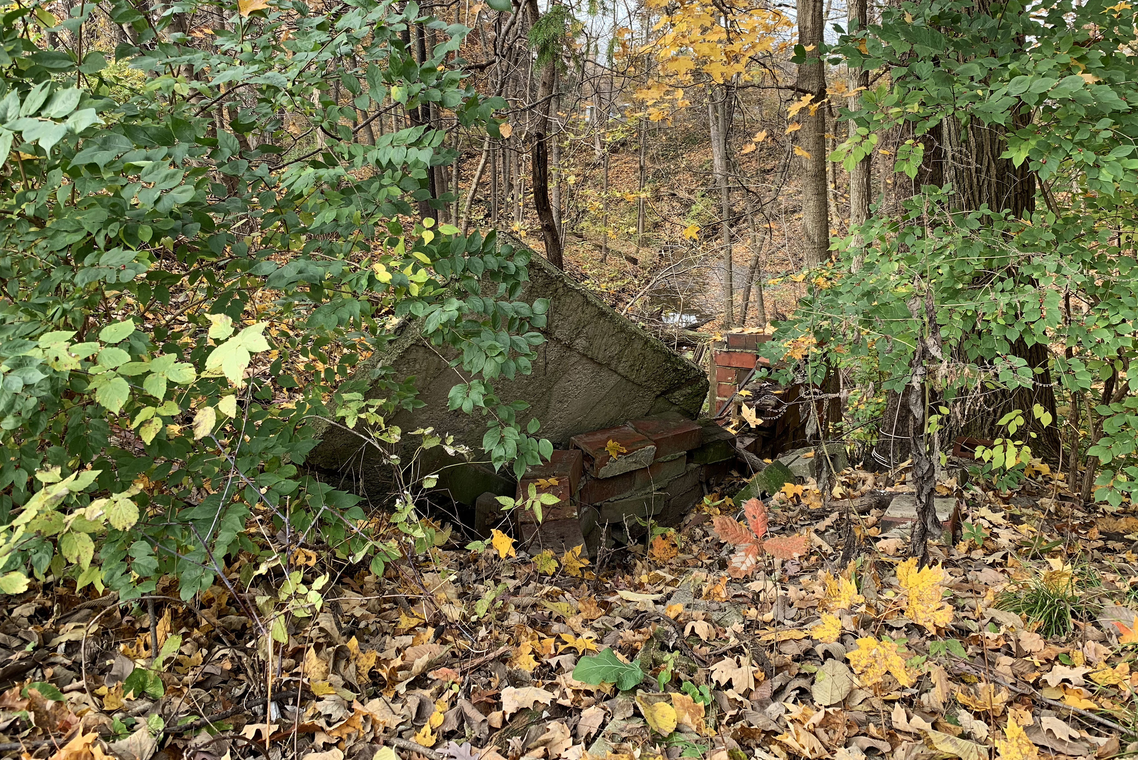 This is a view of the collapsing brick structure located behind the Historic Gardner Homestead as it appeared in November, 2018. The homestead was purchased by the Flint Cemetery in May, 2017, with plans to rehabilitate the building. The property adjoins the cemetery, separated only by a creek and ravine. The structure is located in the wooded hill behind the house that descends down the ravine to the creek.