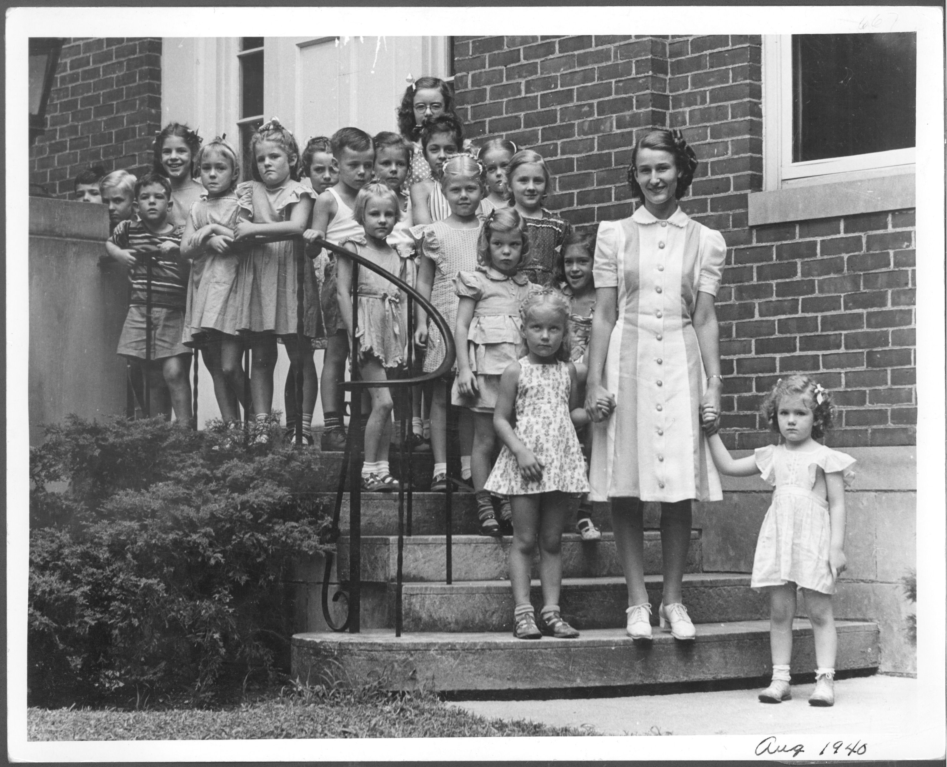 Worthington Public Library's first trained children's librarian was Miss Jean Darby, pictured here with a group of young library patrons on the steps of the James Kilbourne Memorial Library building. In 1943 a dedicated children's room was established in the basement of the library.