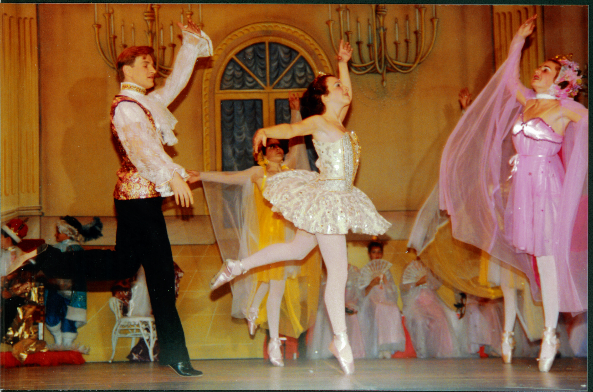 This photograph depicts a scene from the Worthington Civic Ballet's 1993 performance of "Cinderella" featuring Becky Rashid in the lead role, Sara Sibley as the Fairy Godmother and Mark Hite as the Prince. Worthington Civic Ballet and Theater Arts Guild director, Barbara Burrows choreographed the production. The costumes and staging were also designed and created by Miss Burrows.