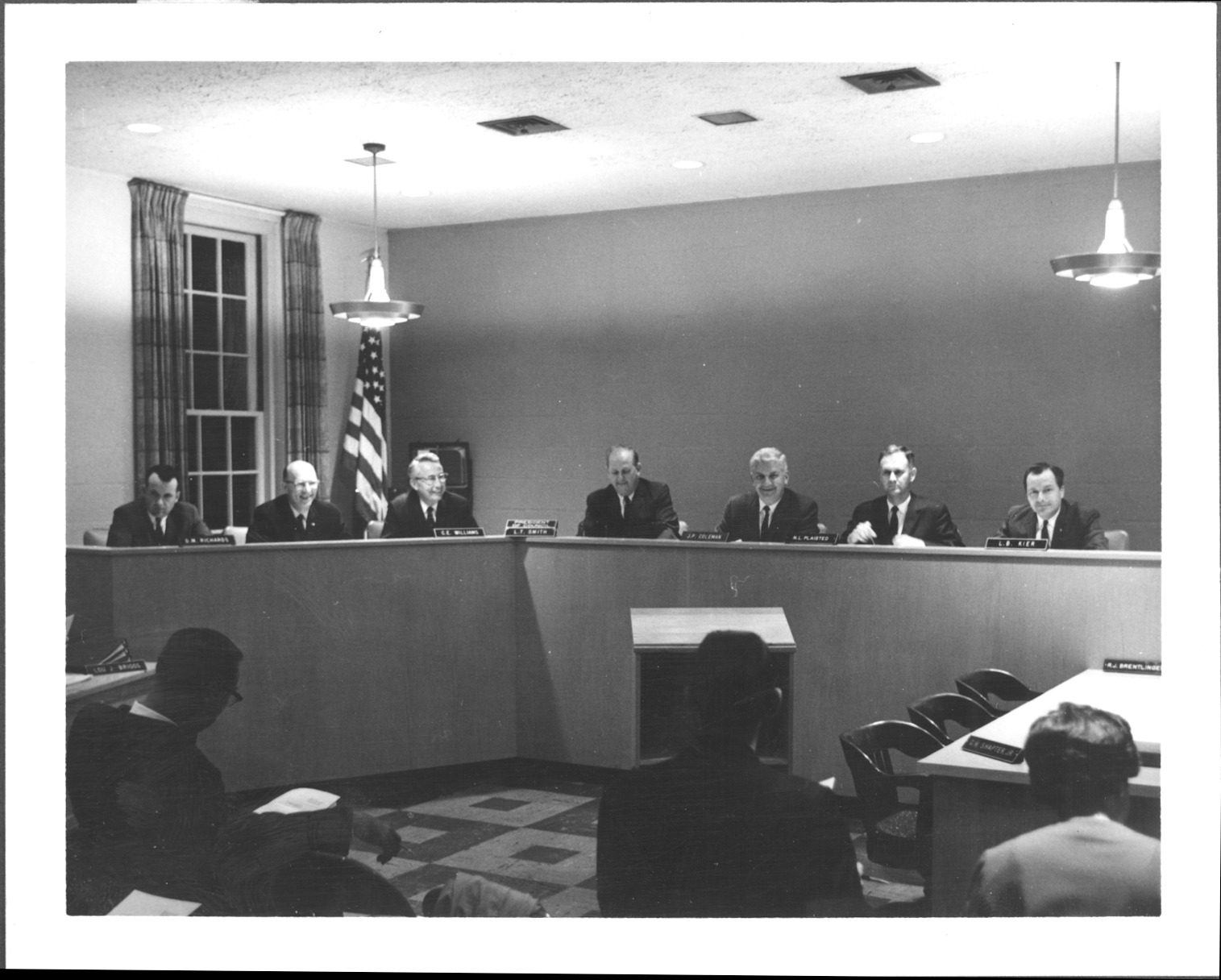 Worthington's City Council members are pictured here in the council chambers at the old City Hall, which was located just north of the Northwest quadrant of the Village Green at the time. Left to right are: G. M. Richards, (?), Cameron Williams, Laben T. Smith, John P. Coleman, N. L. Plaisted, and L. B. Kier.