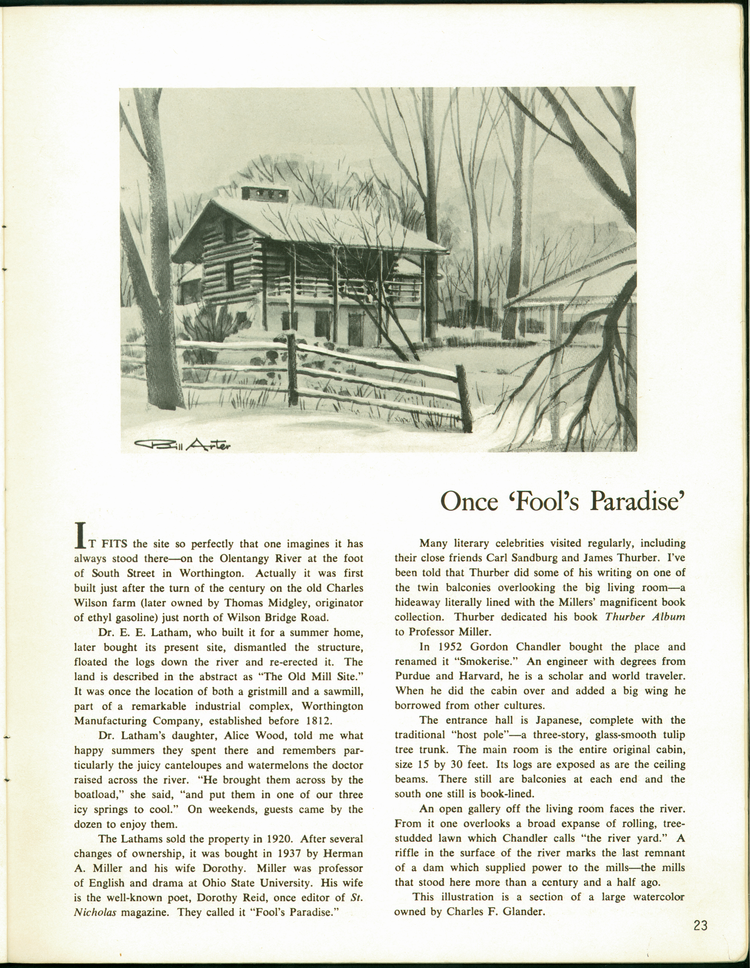 Worthington resident Bill Arter wrote and illustrated the stories of many Columbus and Ohio landmarks in the Columbus Dispatch Magazine in his weekly feature "Columbus Vignettes." From 1964-1971 his talents as writer/illustrator and his passion for researching and exploring old houses were combined in weekly articles, which eventually became four hardbound volumes. In 1975 the articles about locations in Worthington were published in a separate volume entitled "Worthington Vignettes". In the 1950s Arter was published in the Dispatch in features on diverse Ohio subjects from the interurban, the Blennerhessett family, Ohio artist David Blythe, to Edgar Mix, world famous balloonist. Further, Arter was Creative Director and Vice President of an advertising firm and teacher at O.S.U. and Ohio Wesleyan. He also painted watercolors of favorite buildings throughout central Ohio.