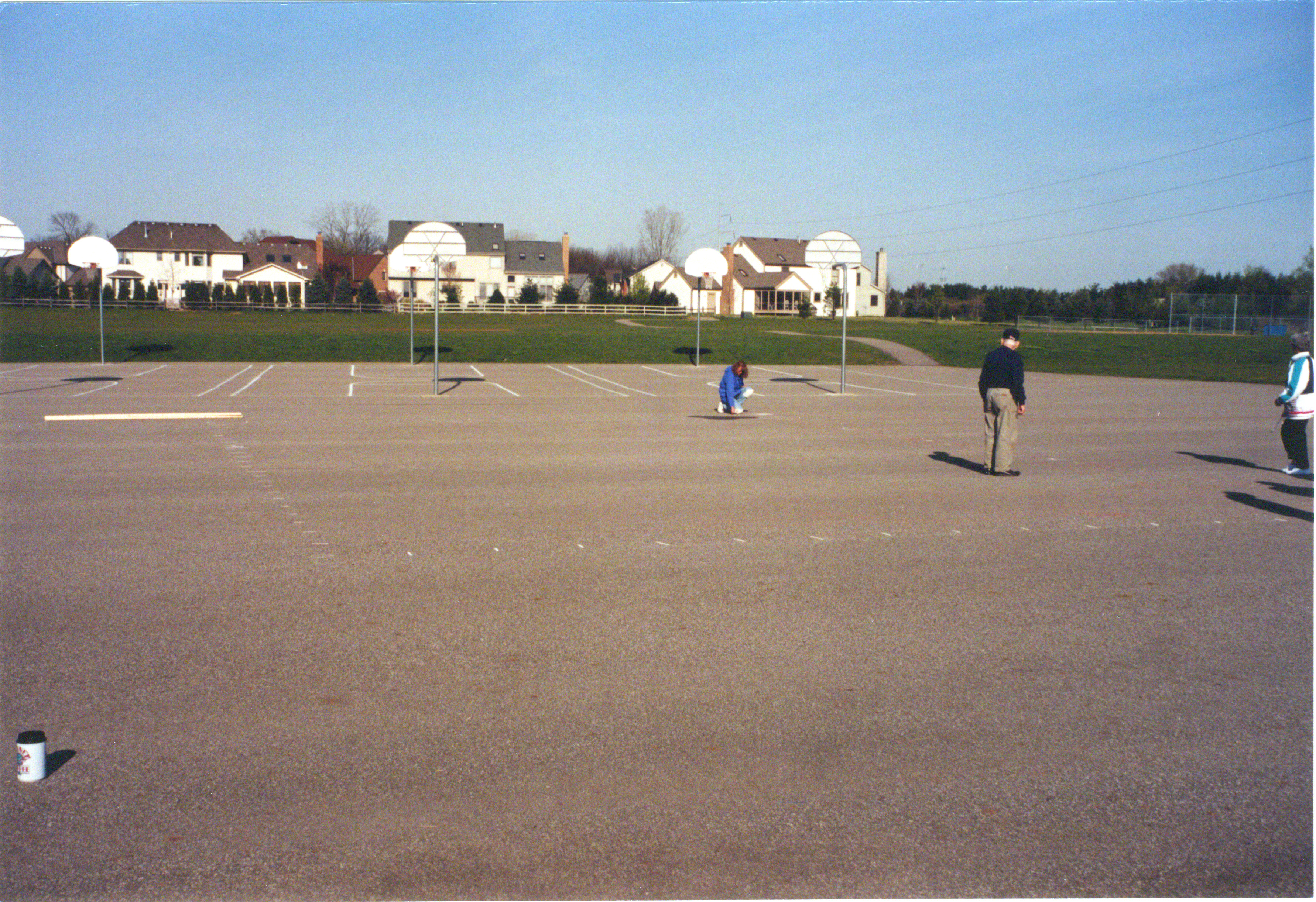 The idea for painting large-scale U.S. maps on the playgrounds of local schools came about when a member of the Dublin-Worthington Rotary Club read about a similar project in another state. The club felt that the maps would be both educational and entertaining for students. The club worked with the Center for Mapping at The Ohio State University, which provided a grid-based master template. After creating a 30- by 50-foot chalk grid on each playground's surface, Rotarians used the master template as a guide to draw chalk outlines of each state. Club members then painted over the chalk outlines to complete the maps. This photograph shows Rotarians creating a chalk grid that will form the basis of the map.