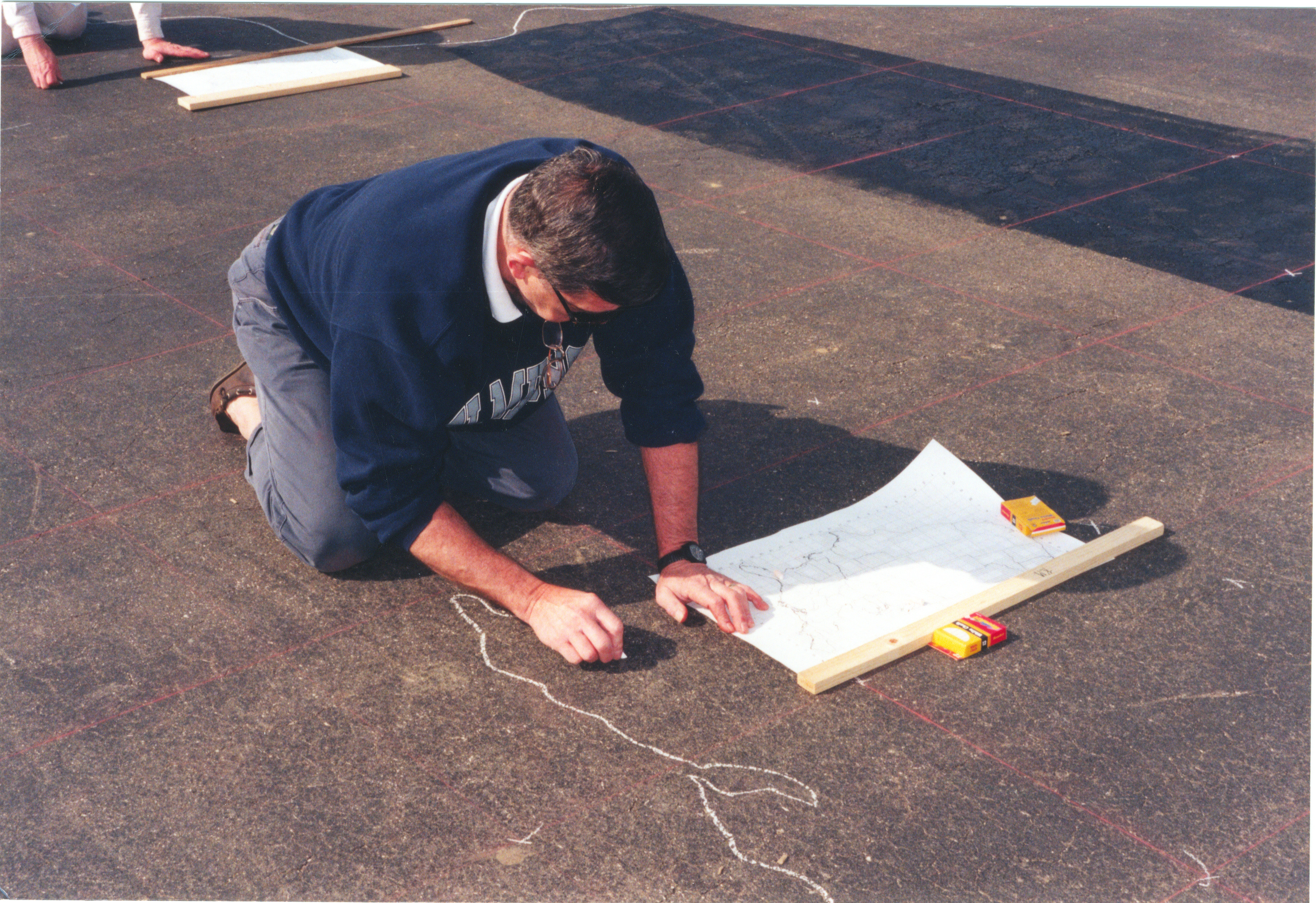 The idea for painting large-scale U.S. maps on the playgrounds of local schools came about when a member of the Dublin-Worthington Rotary Club read about a similar project in another state. The club felt that the maps would be both educational and entertaining for students. The club worked with the Center for Mapping at The Ohio State University, which provided a grid-based master template. After creating a 30- by 50-foot chalk grid on each playground's surface, Rotarians used the master template as a guide to draw chalk outlines of each state. Club members then painted over the chalk outlines to complete the maps. This photograph shows Rotarians using the template to create chalk outlines of each state.