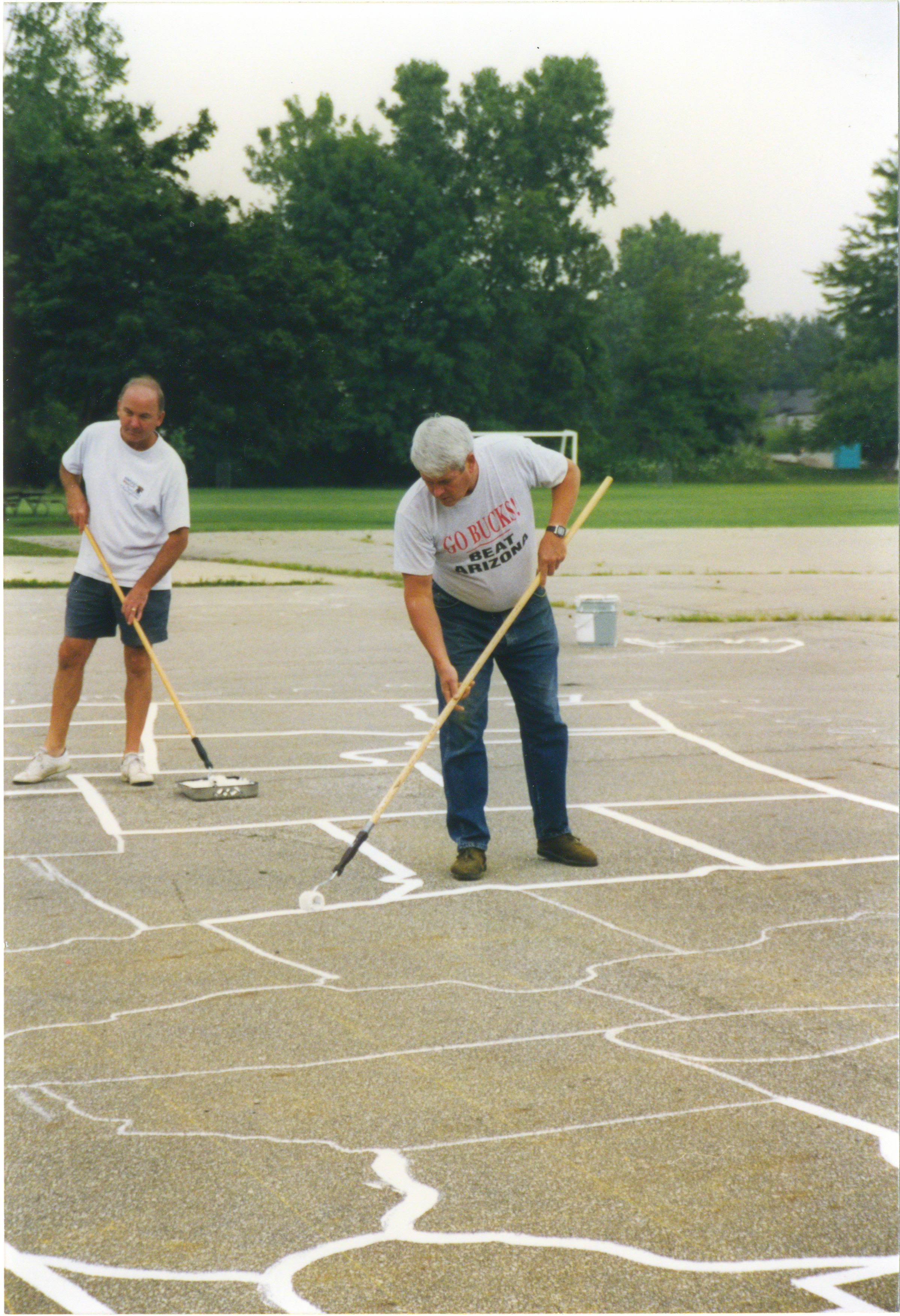 The idea for painting large-scale U.S. maps on the playgrounds of local schools came about when a member of the Dublin-Worthington Rotary Club read about a similar project in another state. The club felt that the maps would be both educational and entertaining for students. The club worked with the Center for Mapping at The Ohio State University, which provided a grid-based master template. After creating a 30- by 50-foot chalk grid on each playground's surface, Rotarians used the master template as a guide to draw chalk outlines of each state. Club members then painted over the chalk outlines to complete the maps. This photograph shows Rotarians painting the state outlines.