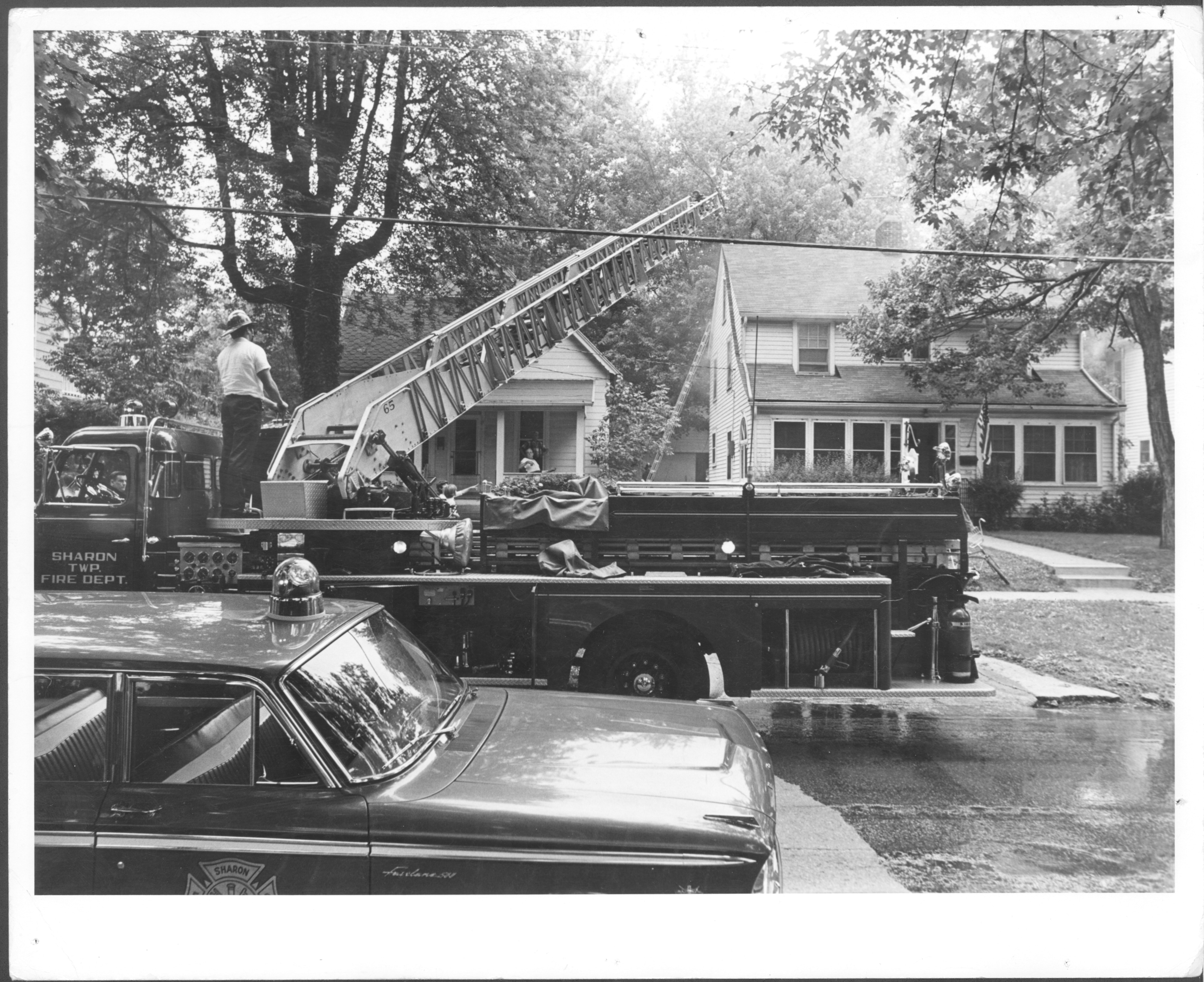 The Sharon Township Fire Department is shown responding to an emergency. A fire department was officially organized in the Village of Worthington in 1916. In 1931 the Sharon Township Fire Department formed, assuming fire protection responsibilities for both Worthington and Sharon Township. Responsibility for the Fire Department was transferred to the City of Worthington in 1993.