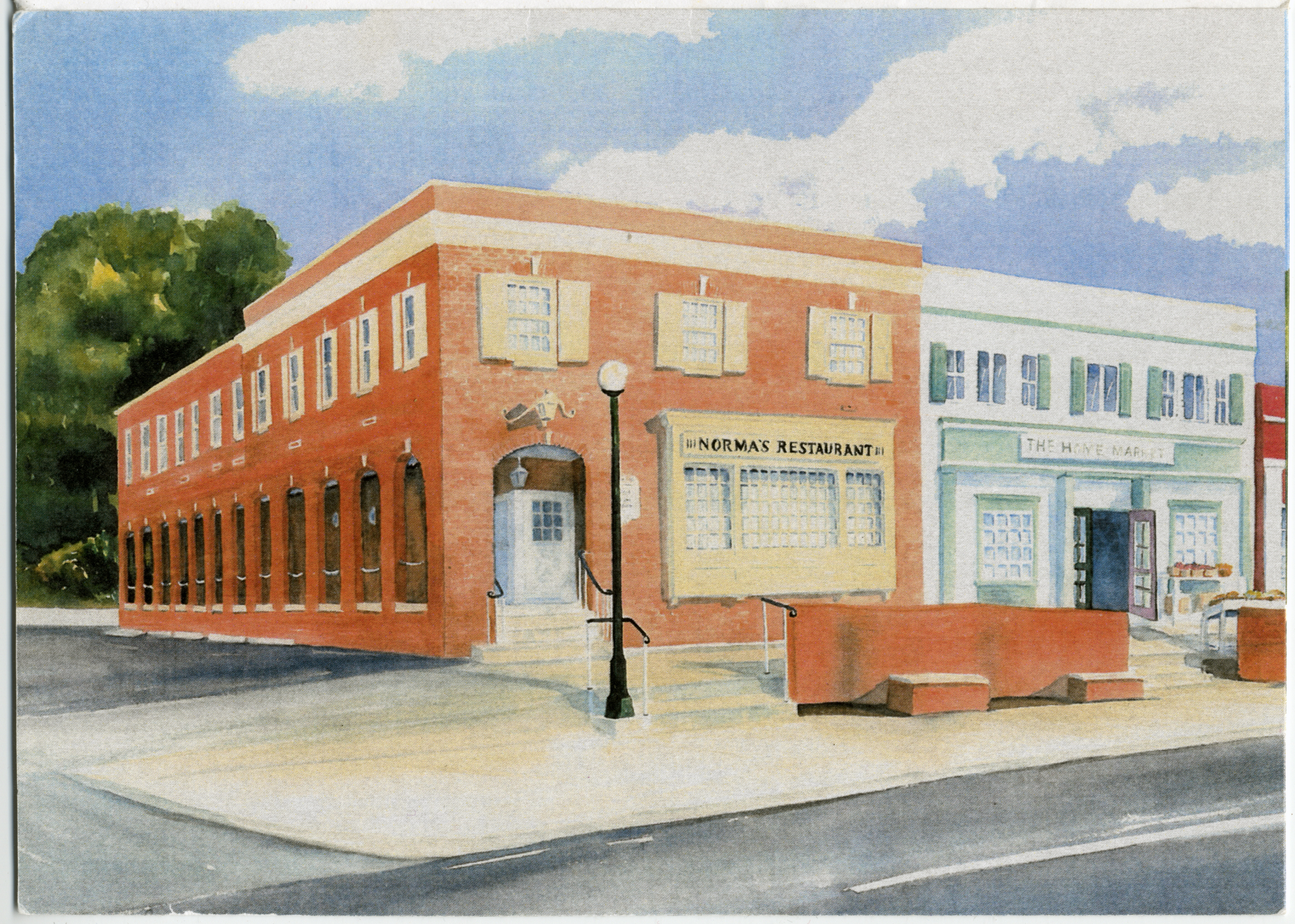 Back of greeting card with the words "Norma's Restaurant, artist Janet Balliett Waggoner"