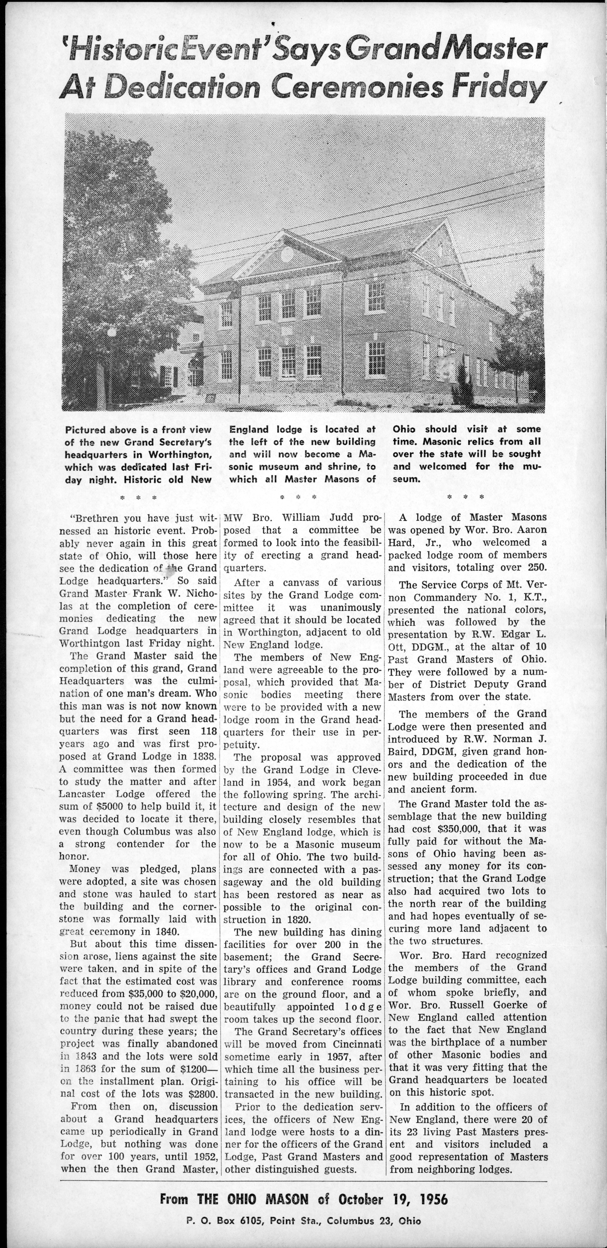 This article appeared in The Ohio Mason, a weekly periodical of the Grand Lodge of Ohio, published 1916 to present. The article reports details of the dedication of new headquarters for the Grand Lodge of Ohio in Worthington on October 12, 1956 and provides a history of events leading up to the decision to construct the Grand Headquarters adjacent to New England Lodge No. 4. A permanent headquarters located in central Ohio had been desired by the Grand Lodge of Ohio as early as 1838. To that end a committee was formed in 1952 to select a site. Worthington was chosen and the Grand Lodge Headquarters were built adjacent to New England Lodge No. 4, which was restored to original form and subsequently serves as the Grand Lodge of Ohio Masonic Museum.