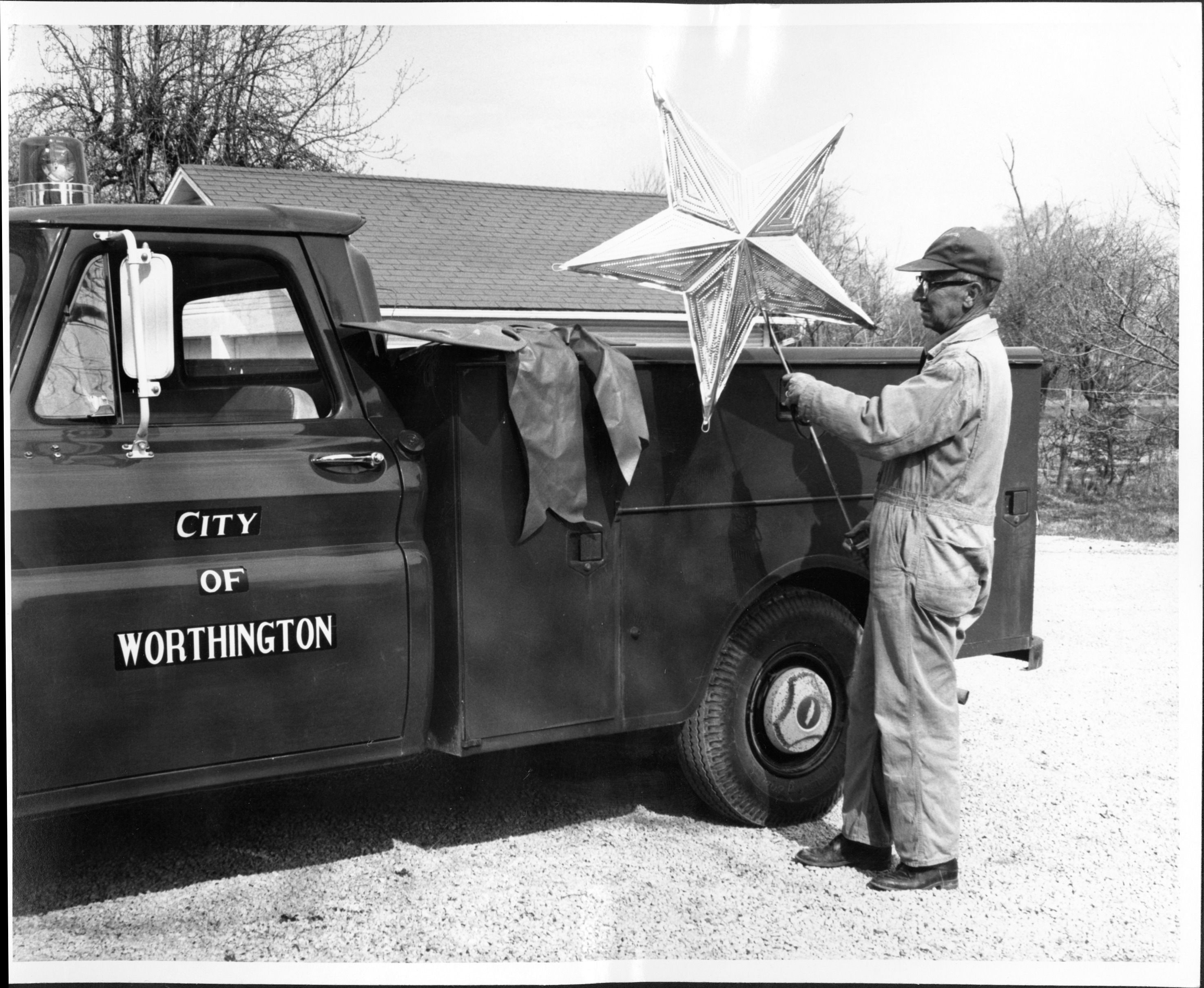 A member of Worthington's Division of Maintenance in the Department of Public Service stores Christmas decorations until the next year's holiday season.