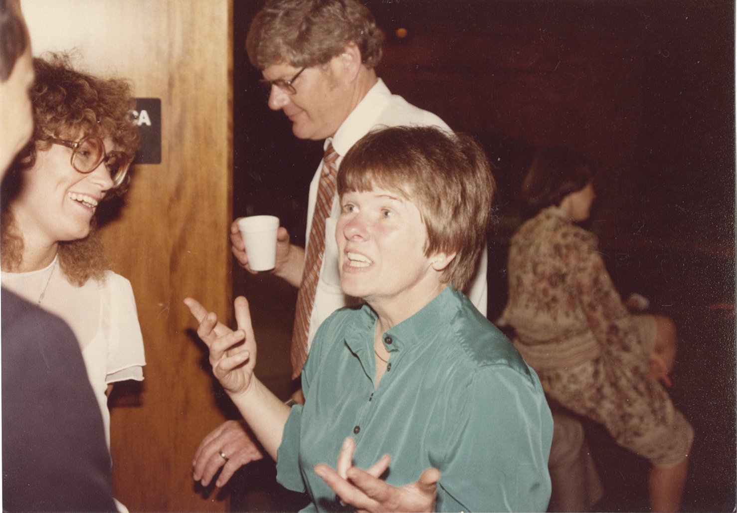 Pictured in this color photo are five people gathered at the Old Worthington Library for librarian Rachel Alexander's wedding, May 8, 1982. The three people whose faces are fully visible in the picture are, left to right, Holly Blake, Alan Osborne, and Bernice Daniels. They are conversing with another person who faces away from the camera; in the background, another attendee sits and faces away from the camera.