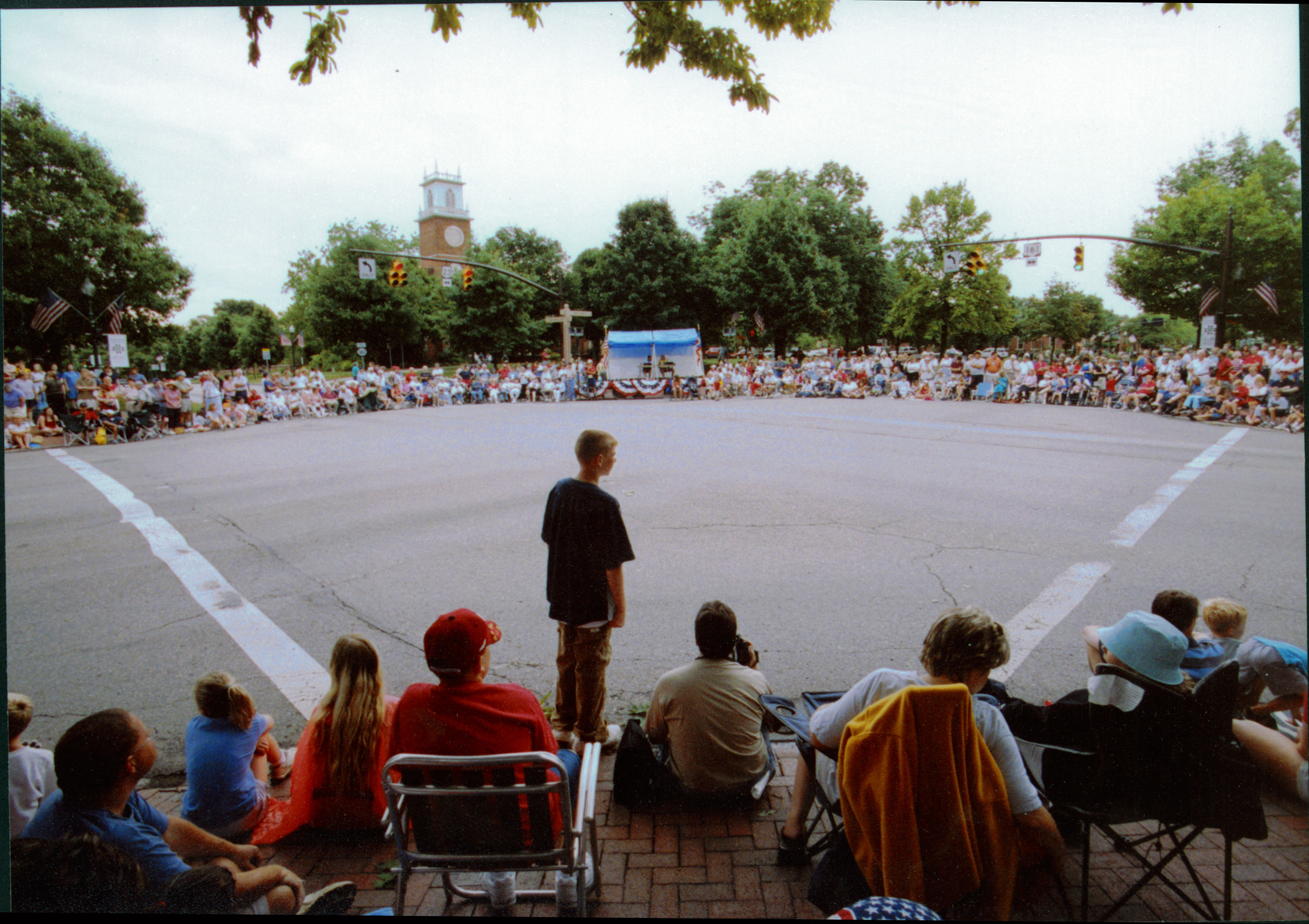The intersection of High Street and Dublin Granville Road is shown here, packed with spectators awaiting the Bicentennial Homecoming Parade. The parade route began at City Hall and traveled south on High Street to the Village Green and west on Dublin Granville Road to Thomas Worthington High School.