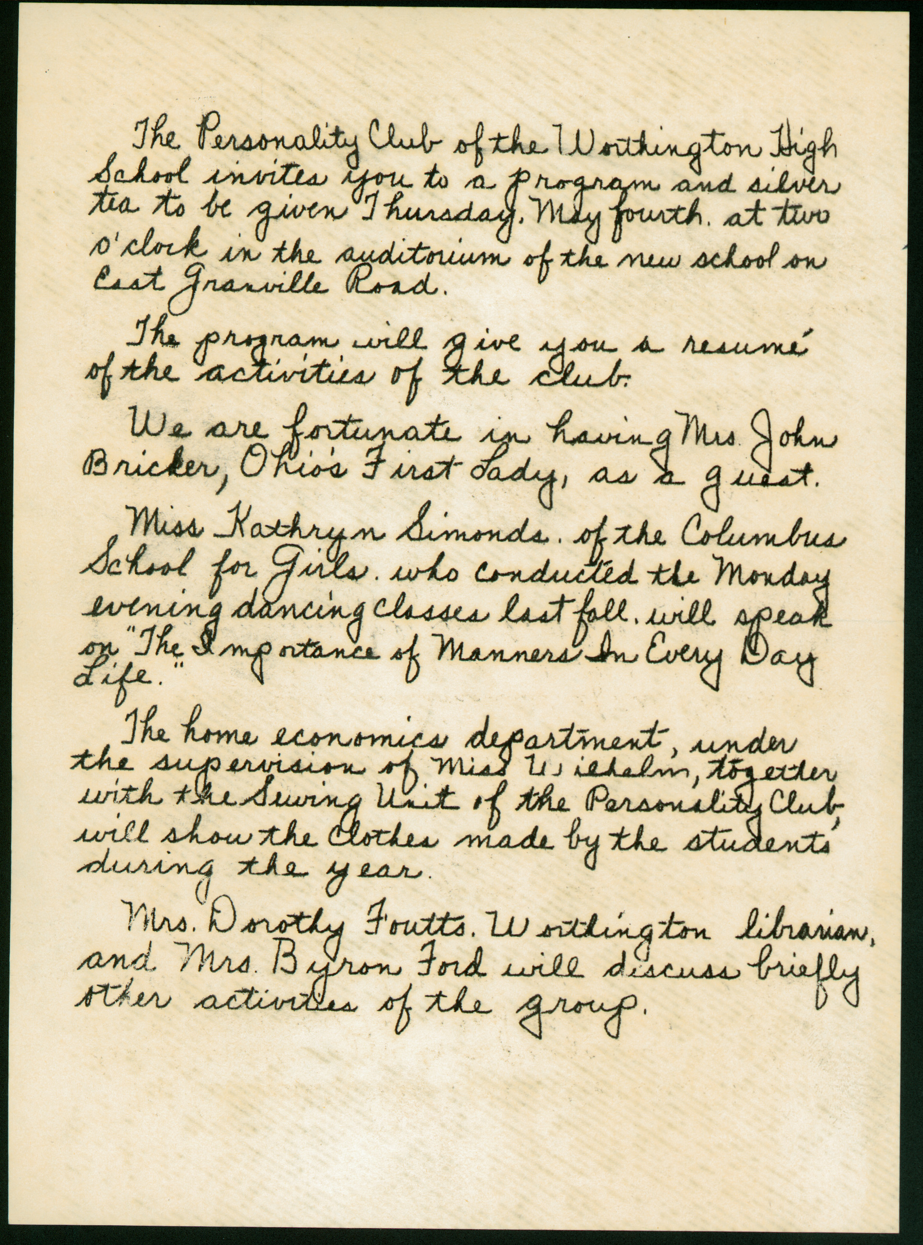 The Personality Club of Worthington's second full year culminated in a program and silver tea. The program included guest speakers on the topic of manners, Kathryn Simonds of the Columbus School for Girls and Ohio's first lady Harriet Day Bricker. Clothing made by home economics students was modeled.