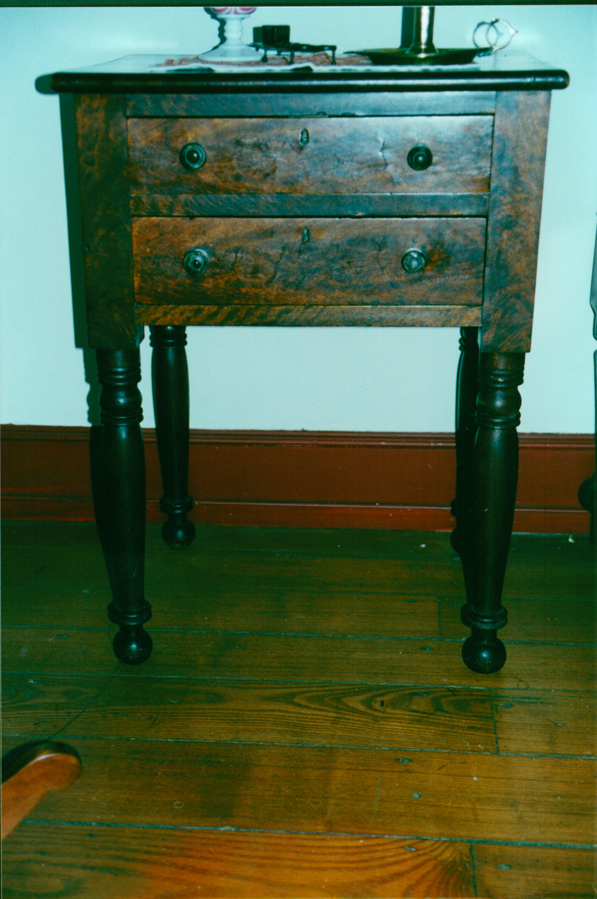 This nightstand belonged to Scioto Company proprietor James Kilbourn. It features cherry veneered crotch, two drawers and turned legs. James Kilbourn was the founder of Worthington, Ohio. Son of an impoverished farmer, he set out on his own at 16, illiterate and poor. Self-educated and self-made, his life typifies the frontier entrepreneur. He founded the cities of Worthington, Bucyrus, Norton, Lockbourne, Sandusky, served in the U.S. Congress, and was active in the religious and political life of Columbus and Ohio.