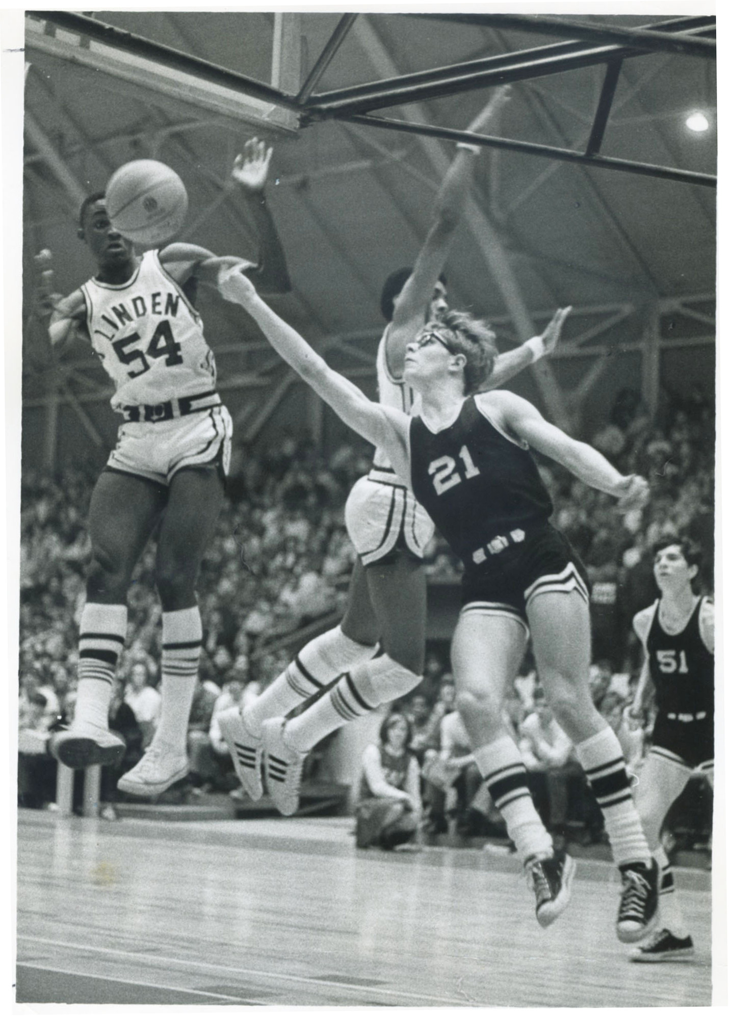 This black-and-white photograph shows a Worthington High School Cardinals basketball game in action in March, 1970. Guard John I. Snouffer (player 21) and a player from Linden-McKinley High School both reach for the ball; behind them another Linden-McKinley and WHS player, Brad Forward (#51) can be seen. The Cardinals defeated Linden-McKinley in the Central District Tournament at the Fairgrounds Coliseum, before a packed house, on a last-second shot by senior co-captain Forward.