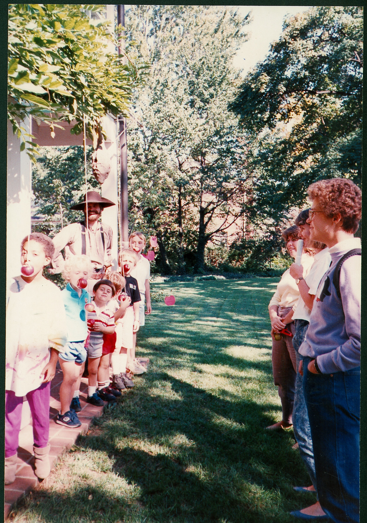 Children take part in an Apple Snapping contest in the garden at the Orange Johnson House Museum. Steve Frazier, in period costume, supervises the children's activities for the Johnny Appleseed Day celebration. The event was hosted by the Worthington Historical Society to honor the contributions of John Chapman