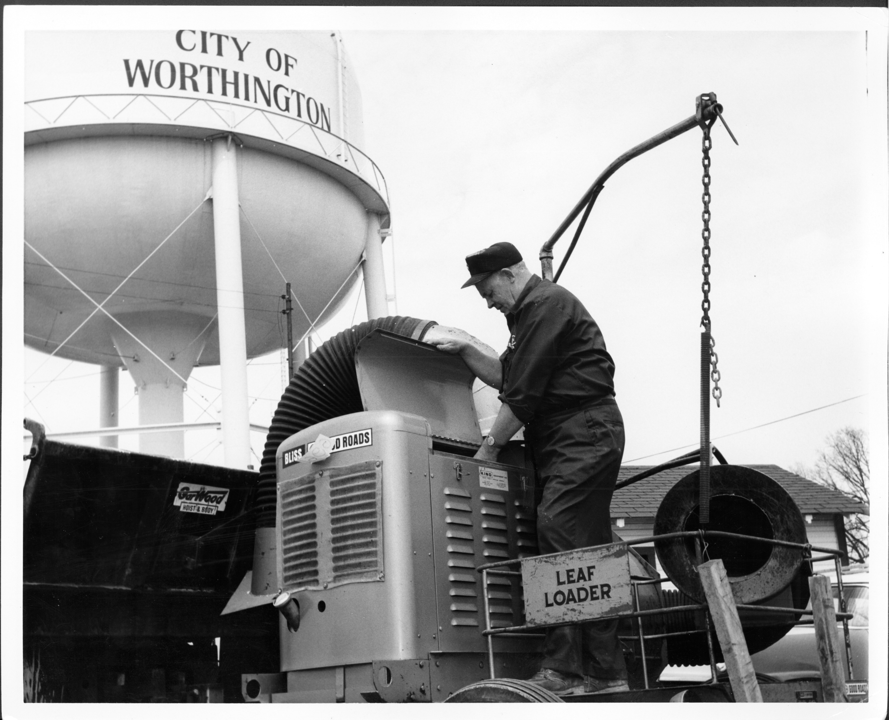 An employee of the City of Worthington's Department of Public Service works on leaf pick-up. In 1969 the City expended 1900 hours on leaf collection. This photograph was taken at the City's Highland Avenue service area, the City's last water tower in the background.