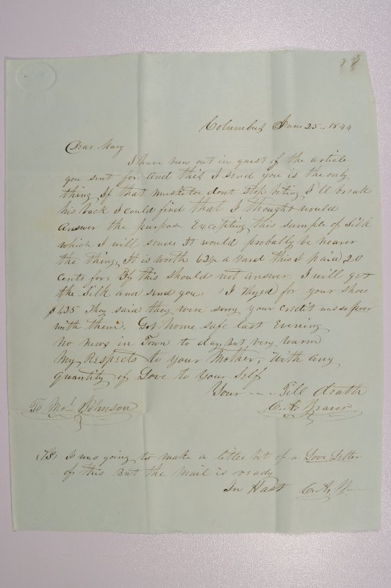 This is a brief letter written to Mary Johnson of Worthington, Ohio from C. A. Weaver of Columbus, Ohio to notify Miss Johnson that she would be receiving a sample of silk that she had requested. C. A. Weaver goes on to tell Mary that a bill of $1.25 for shoes has been paid. Regrets are relayed to Mary through Weaver from the shoe store concerning her poor credit.