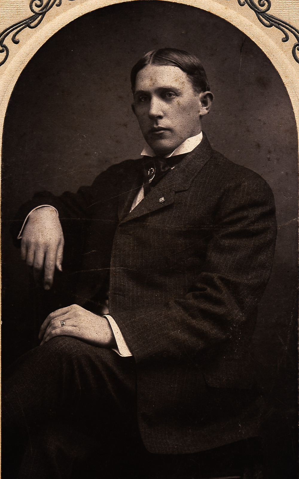 The man in this photograph is identified by the surname Boardman, and lived in a house at the intersection of High St. and North St. in Worthington around the beginning of the 20th century and had a connection to the Maynard family. The 1900 census of Worthington (Sharon Township) shows a Boardman family and two members of a Maynard family residing together in the community. Members of the household were listed in the census as Jas Boardman (b. 1840), Julia Joseph Boardman (b. 1831), Clara F. Boardman (b. 1858), Harry M. Boardman (b. 1861), Francis W. Boardman (b. 1893), E. N. Maynard (b. 1805) and Henryetta Maynard (b. 1894).