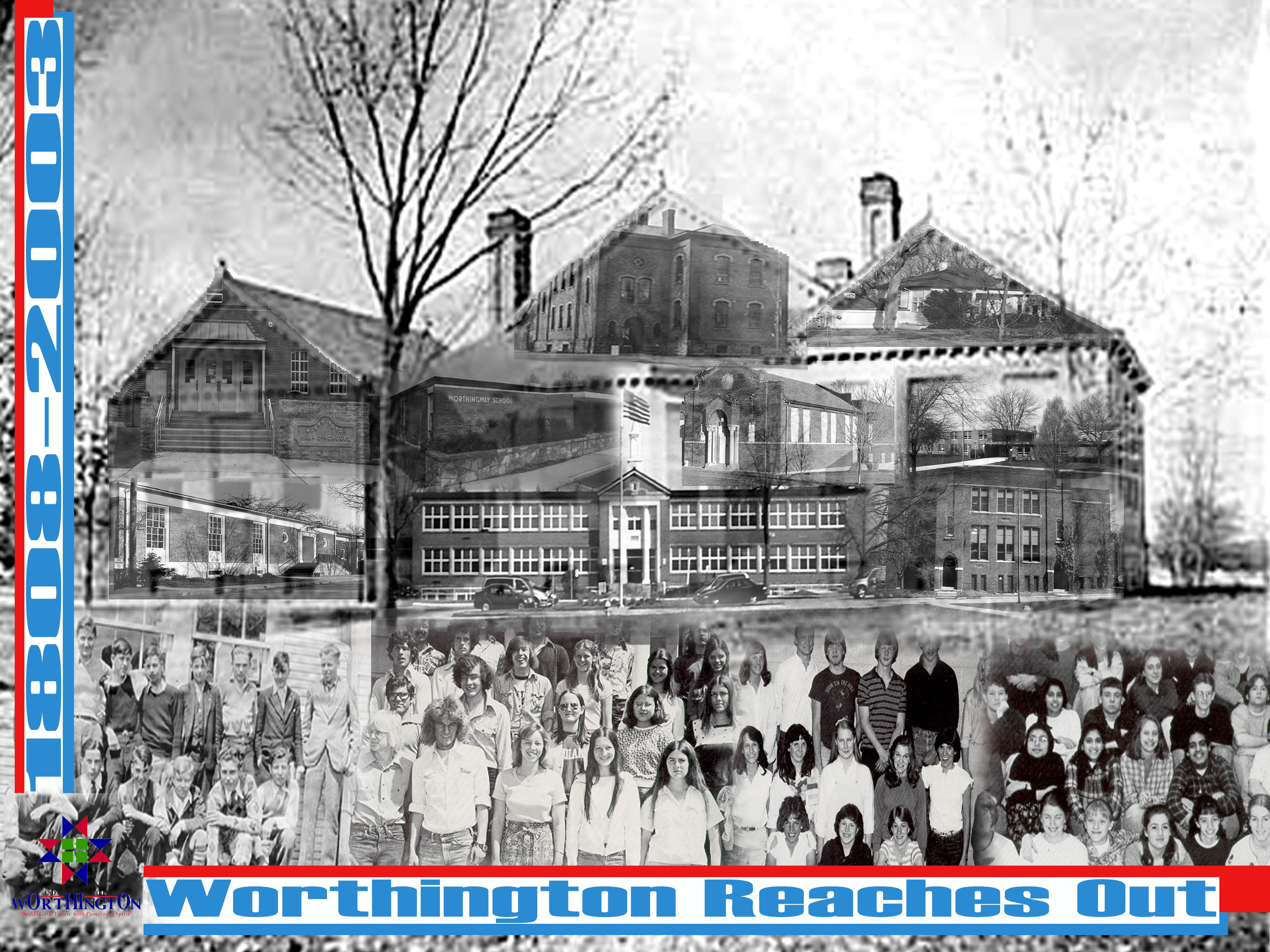 This graphic art montage was created by a student in the Advanced MultiMedia class at Thomas Worthington High School. The class created montages of historic and contemporary images for a Worthington Bicentennial school project. Students created one composite image from many individual images. Using Adobe PhotoShop graphic design software, they developed advanced graphic design and multimedia skills and techniques. The montages, measuring at least 18 x 24 inches were printed and mounted.