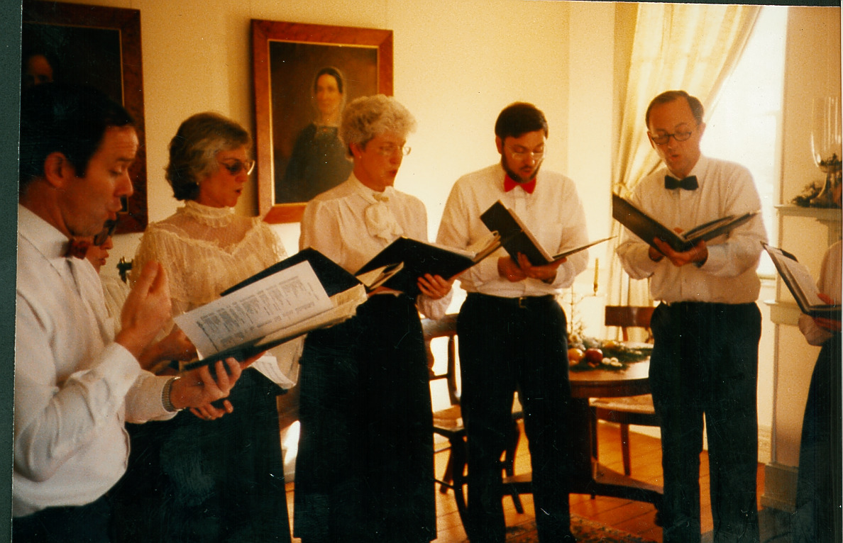 The Orange Johnson Singers, led by Charlie Warner (far left), are pictured in the parlor of the Orange Johnson House Museum during the 1990 holiday season. The Orange Johnson Singers perform historical music. The group performed for the Christmas Open House at the Orange Johnson House December 2nd and 3rd in 1990.