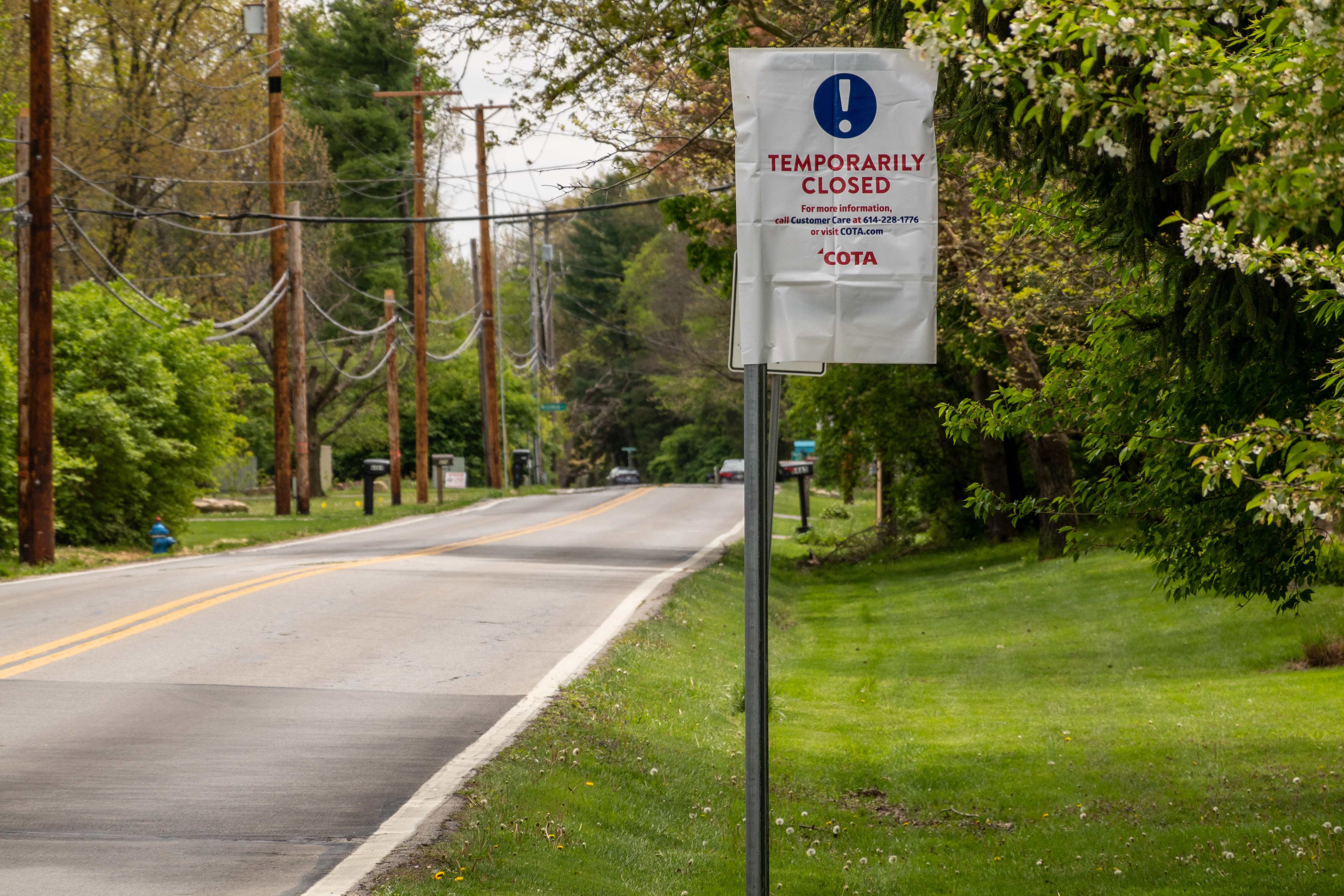 This closed bus stop was one of many indicators of the impact of the pandemic on Worthington and surrounding areas. The city's normally busy streets and public places were quiet during the spring of 2020 due to Ohio's historic stay at home order to combat the COVID-19 pandemic. Issued by Governor Mike DeWine, Lt. Governor Jon Husted and Ohio Department of Health Director Amy Acton M.D. MPH, the order went into effect on Monday, March 23, 2020 at 11:59 pm. The order closed nonessential businesses, restricted gatherings, ordered all residents to stay in their homes except for certain exempt activities, and limited travel. The order was fully lifted on May 19, replaced by strong recommendations for social distancing.