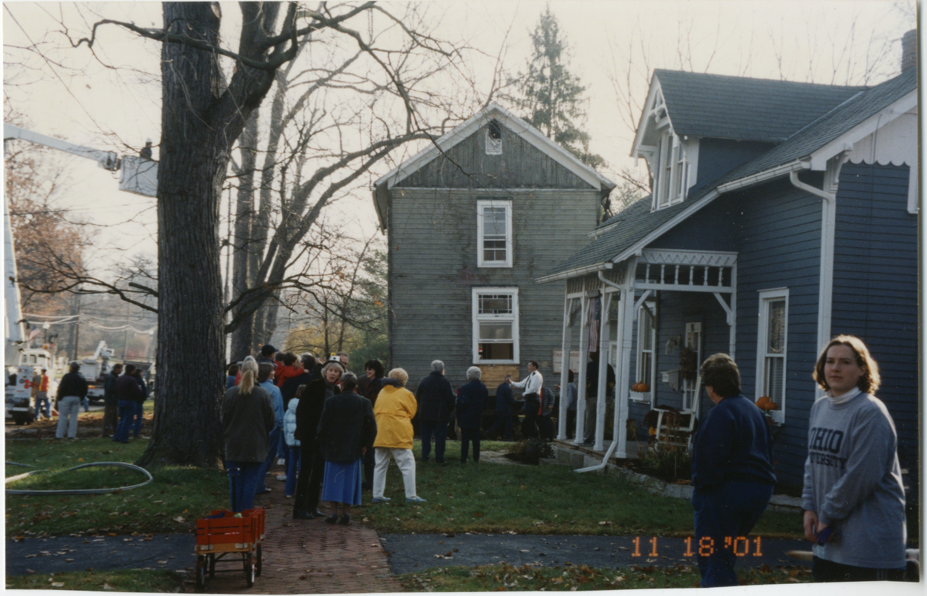 This photograph shows the structure known as the Griswold house after a move through Worthington on a flatbed truck on the morning of November 18, 2001. The house was moved from 788 Hartford Street to 95 East Dublin-Granville Road over the course of about 90 minutes, with residents gathered along the route watching and taking photographs.