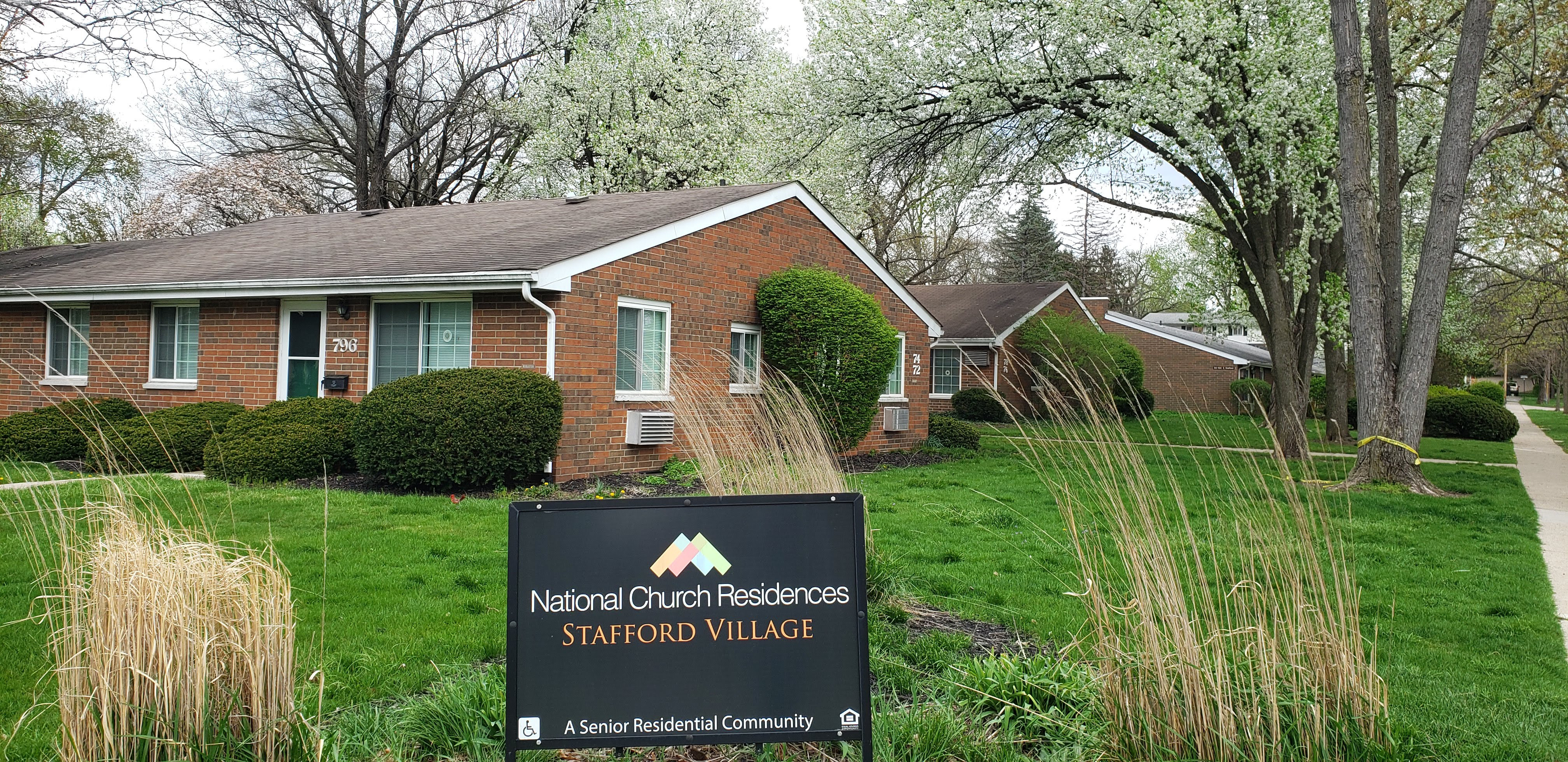 In the foreground a yard sign states "National Church Residences/Stafford Village/A Senior Residential Community." In 2015, National Church Residences (NCR) purchased the 65 units composing Stafford Village. NCR already owned the 23 units making up Stafford Court, located across Hartford Street from Stafford Village. NCR had managed Stafford Village since 2001, although the property was owned by an independent board that included representatives of Worthington Presbyterian Church.