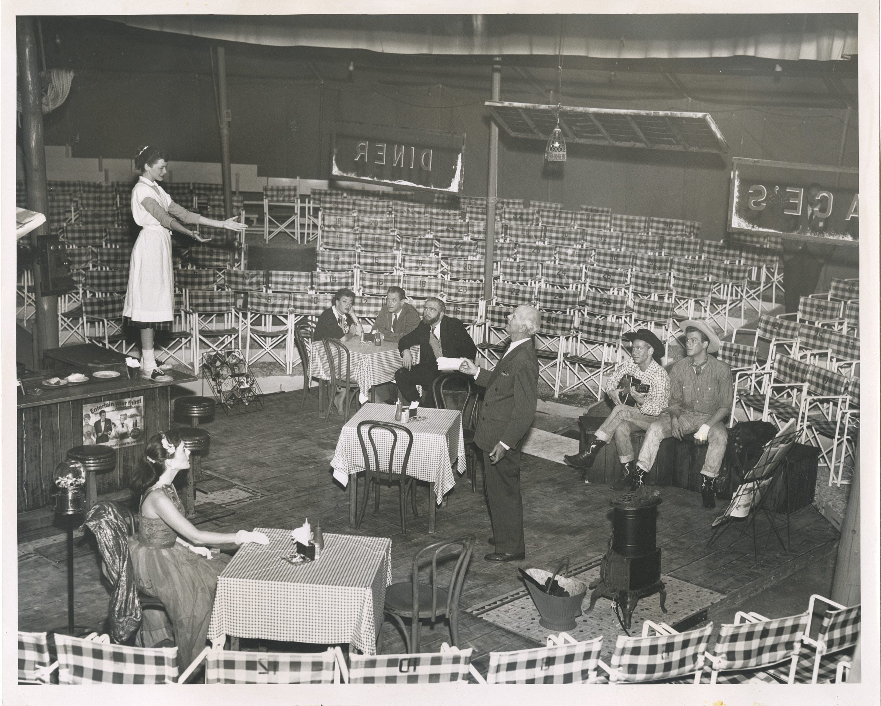 This black-and-white photograph shows actors posed on the stage of Playhouse on the Green (POG) for a publicity photo for the production of "Bus Stop," which ran from June 20-22, 1957. One actor stands the counter of a diner on the set, her arms outstretched, while seven other actors stand and are seated around the set. The empty, checkered seats of the theater are visible behind them.