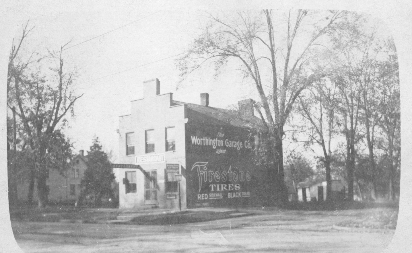 The building was sold in 1916 to Dr. Claude Longenecker, a dentist. He renovated the building in 1919, removing the original Dutch facade shown in this picture. The sign in front advertises a "RESTAURANT", but the advertisements painted on the side are for the Worthington Garage located at 625 High Street and Firestone tires.