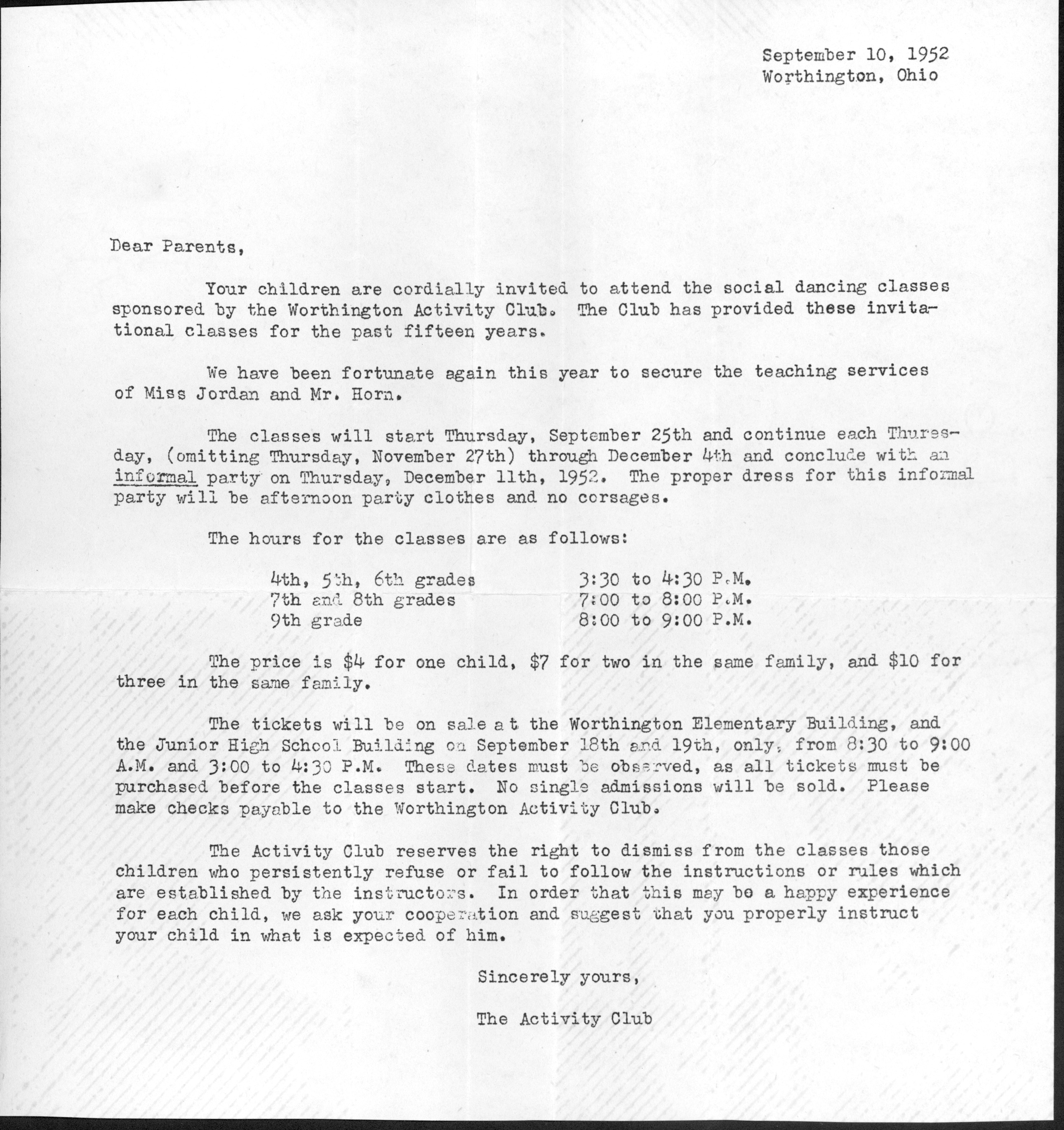 The Activity Club was founded in 1937 as the Personality Club by Mrs. Miriam Mackay, who saw a great need to form an organization dedicated to assisting youth with their social and personal problems. The club was originally formed with sponsorship by the Worthington P.T.A. Among the first activities of the group was the remodeling of formals for girls who were in need of them. Guidance concerning proper dress, manners and hostess etiquette were in demand. Although the club's focus was initially on girls, boys soon became interested and were also included in the programs. Over the years interests broadened, and the group was reorganized as the Activity Club. Social dancing classes for students from grade 4 to 12 became a major activity of the club during the 1940s and 1950s. Interest in dancing declined during the 1960s. Following a brief renewal of interest in dancing in the late 1970s, the emphasis on dance programs was discontinued.