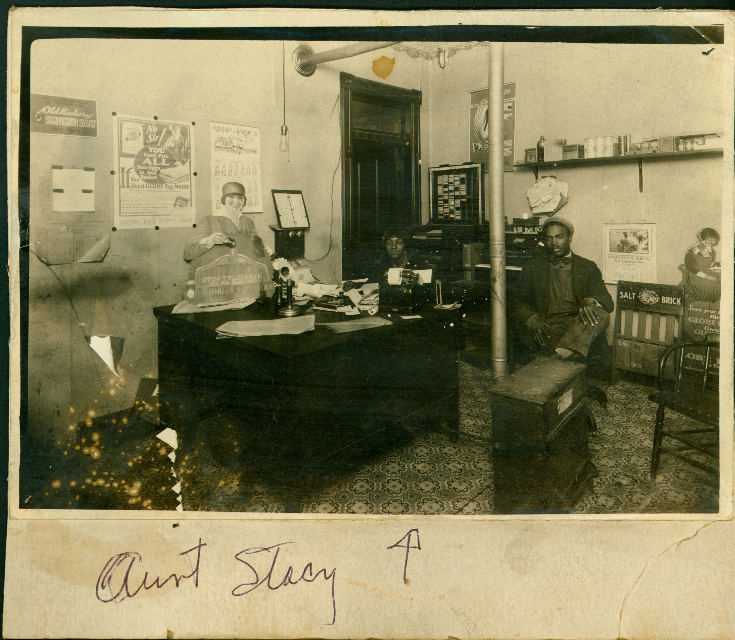 Pictured here are Stacey Marie (Lee) Calloway, seated at the desk in an office of the Worthington Feed and Transfer Company, and an unidentified young man. Stacey Calloway (b. 1898, d. 1967) was employed as the secretary for the Worthington Feed and Transfer Company, owned by Squire Todd. The company was located at 680 High Street and operated from 1914 to 1934.