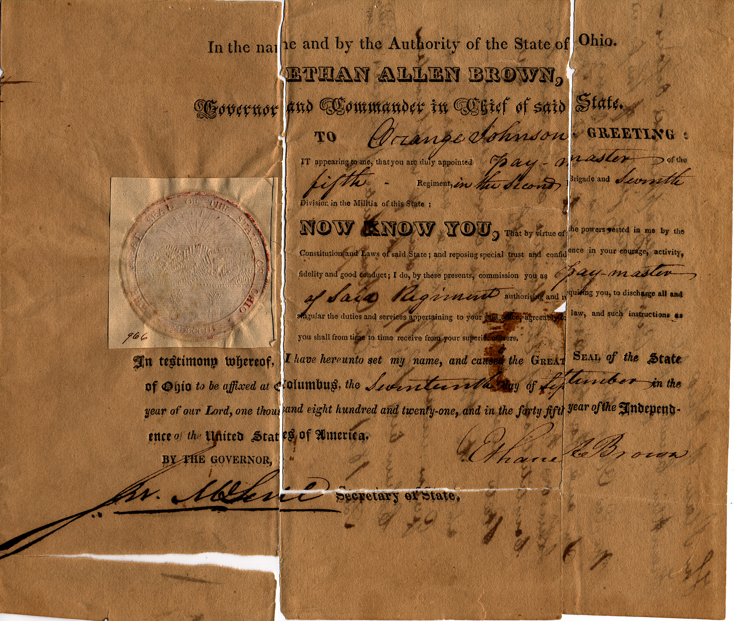 This certificate documents the appointment of Orange Johnson as the Paymaster of the Ohio State Militia, 5th Regiment, 2nd Brigade, 7th Division, which was the local unit for the Village of Worthington. At the time the Governor of the State of Ohio was Ethan Allen Brown, and the Ohio Secretary of State was Jeremiah Mclene. Orange Johnson (b. 1790, d. 1876) migrated to Worthington from Connecticut in 1814 and became a successful manufacturer and banker in the community.