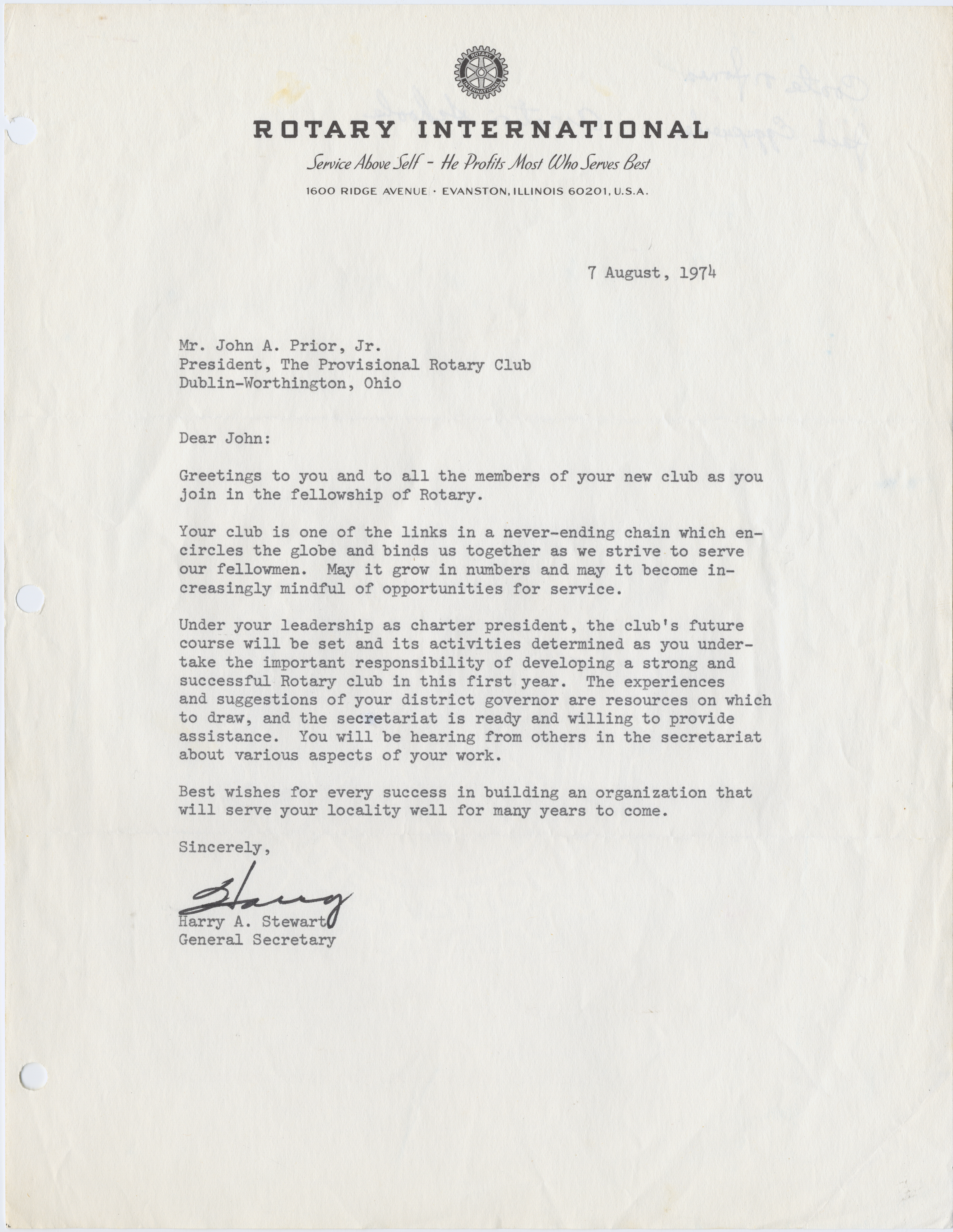 This letter welcomes the provisional Dublin-Worthington Rotary Club to Rotary International. The club was founded by Jack A. Prior, Jr. His father was a member of Columbus Rotary, but when Jack attempted to join Rotary his business classification was already occupied at both the Columbus and Upper Arlington clubs. With the help of Columbus Rotarians Barney Barnett and Frederick Stecker, Prior and local physician Louis Goorey held the first organizational meeting of a proposed new club in May of 1974, with five prospective members and advisor Fred Stecker in attendance. By July the prospective club had reached 35 members, and the charter application was submitted to Rotary International in August. The Dublin-Worthington Rotary Club received its official acceptance via telegram on 3 September 1974.