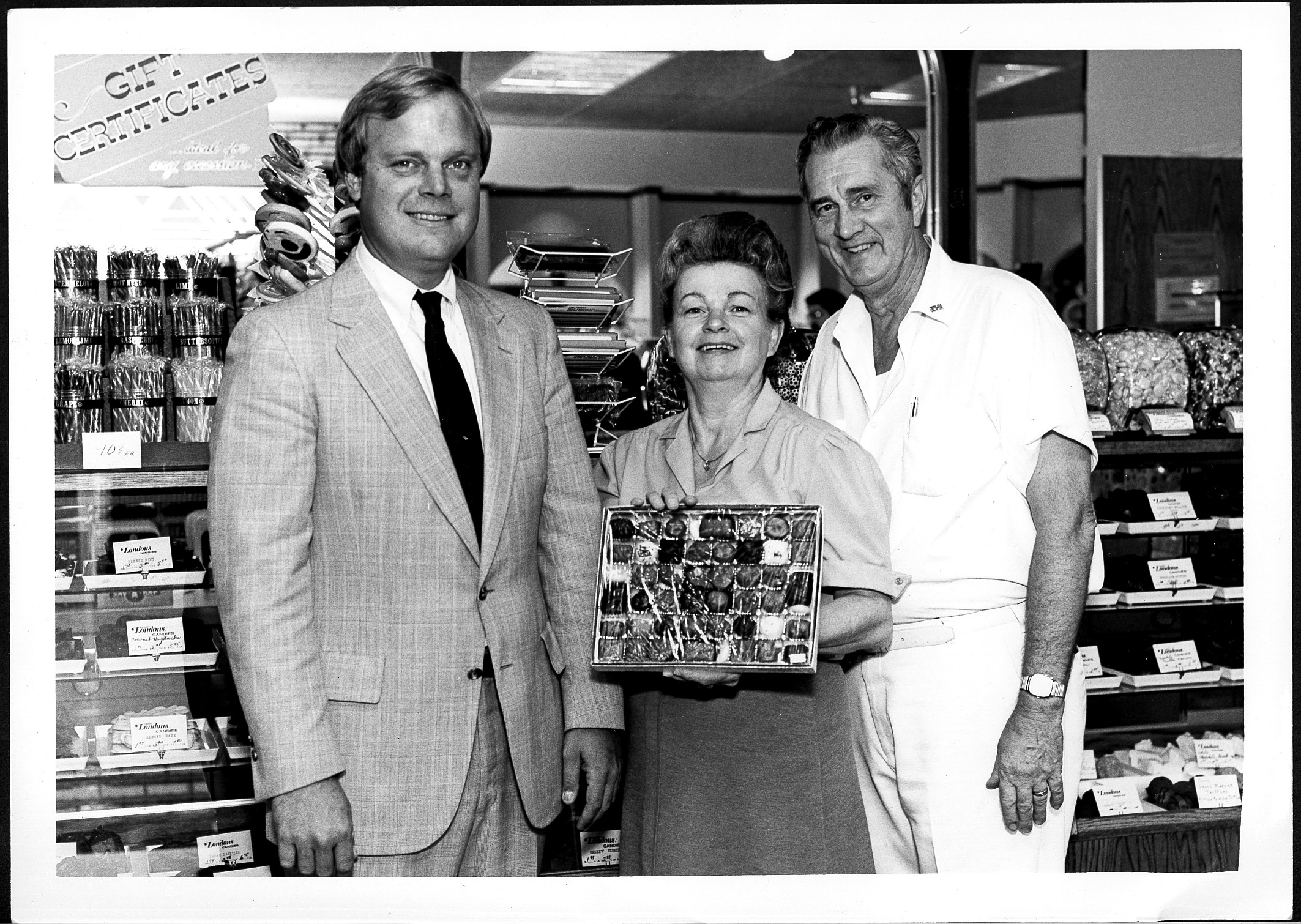 Bob Bowen (left), Vice President of marketing for Planned Communities Inc. stands with Betty and John Saikas, who owned the recently opened Worthington Chocolate Shoppe in the Worthington Square Shopping Center.