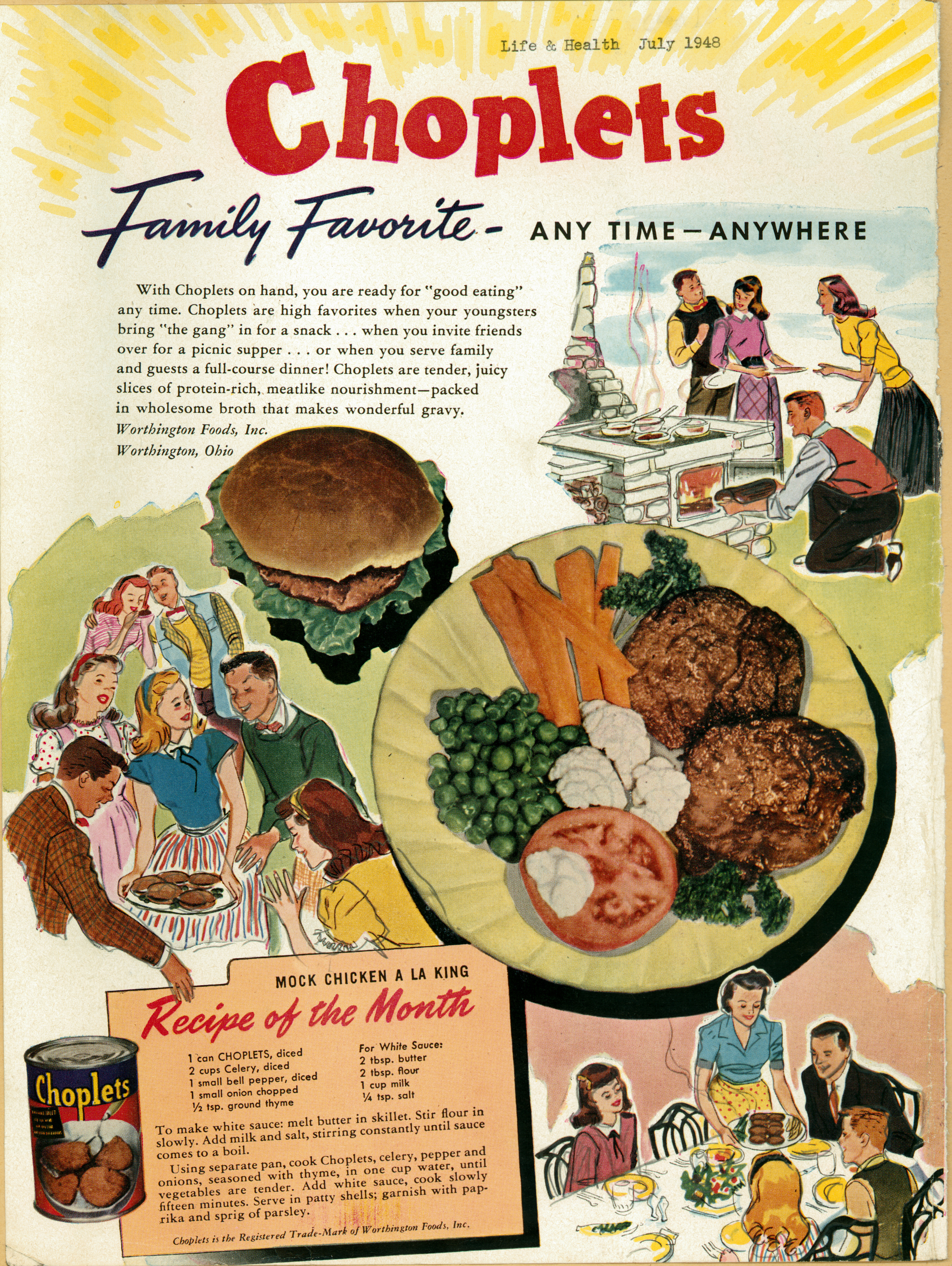 This advertisement appeared in Health and Life magazine in 1948, and was first color ad ever used for Worthington Foods. James L. Hagle, who became business manager for the company in 1941 sought to expand the Worthington Foods market through advertisements in health food magazines such as Health and Health and Life, in addition to direct mail. The product featured here is Choplets. Worthington Foods advertisements frequently featured recipes such as this one for Mock Chicken a la King.