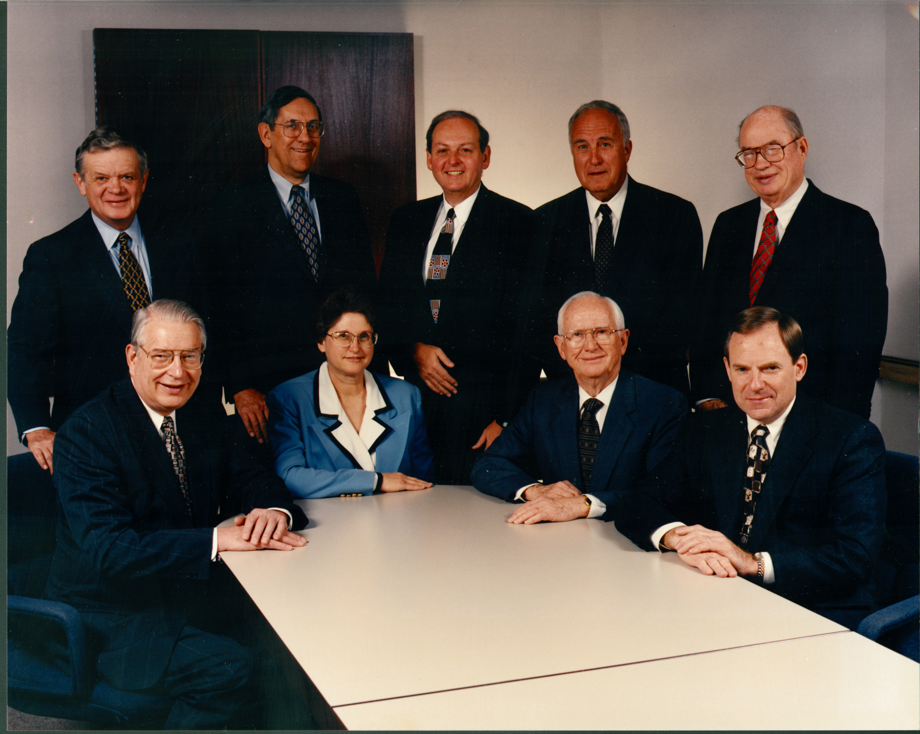 The Board of Directors of Worthington Foods is pictured here in 1995. Front row left to right are: Dr. George Harding IV, Lynn Behrens, Allan Buller and Dr. Dale Twomley. Back row left to right are: Donald Shackelford, Theodore Hamer, Roger Blackwell, Donald Orrick and Berne Gorlich.