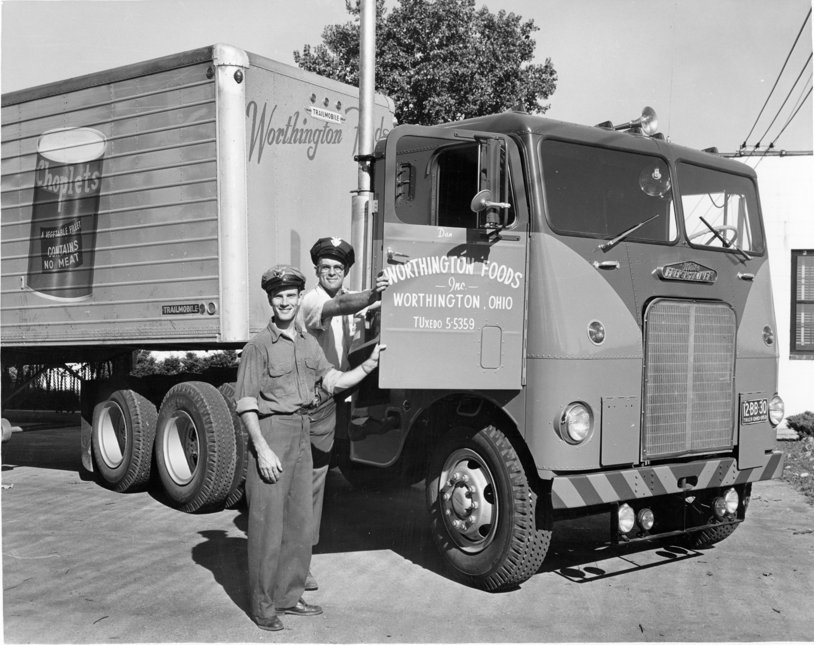 Two drivers for Worthington Foods are shown here with one of the fleet of semi trucks which were used to transport products to branch warehouses. During the 1950s Worthington Foods began setting up branch warehouses. The first was in Portland, Oregon to serve the market in the northwest. Within the next few years warehouses were secured in California, Florida, Maryland and Massachusetts. Worthington Foods had opened its ninth warehouse by 1967.