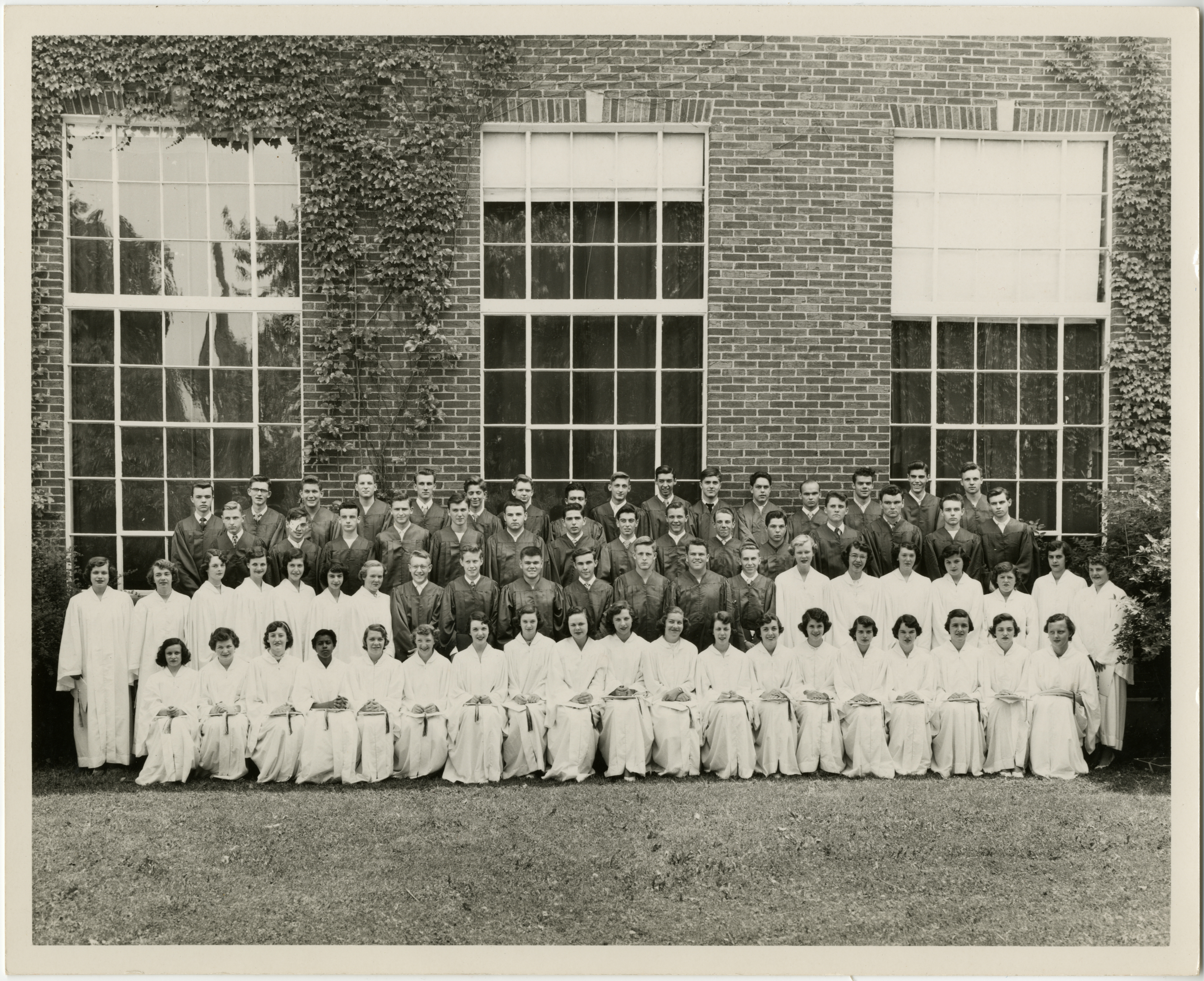 This photo shows the Worthington High School graduating class of 1951. One student in this photograph has been identified: Harlan K. Snouffer (b. 1934) is in the middle of the third row, seventh from the left.