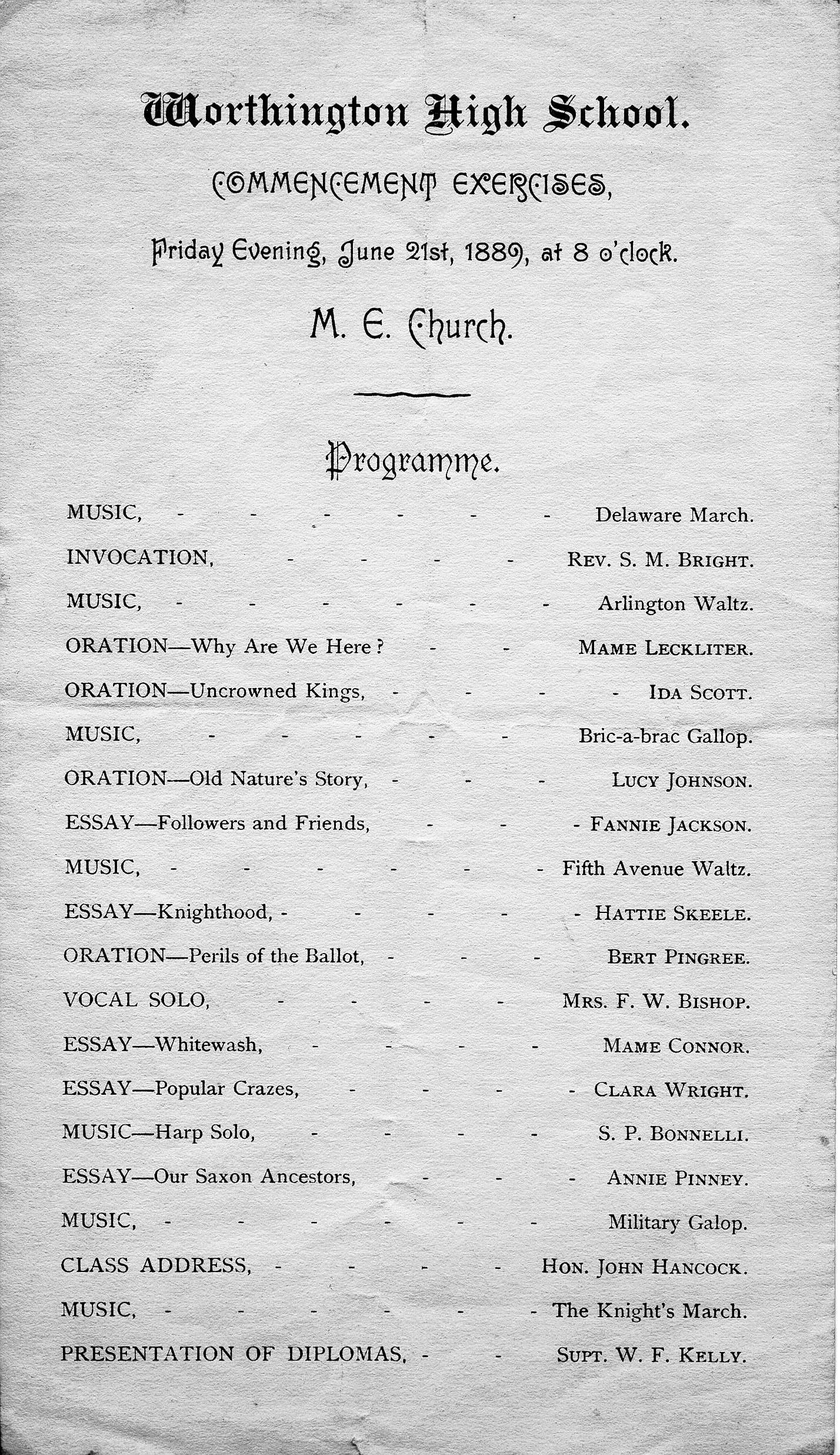 This is a commencement program from the 1889 graduating class of Worthington High School. Graduates were Mamie Connor, Fannie Jackson, Lucy Johnson, Mame Leckliter, Bert Pingree, Annie Pinney, Ida Scott, Hattie Skeele, and Clara Wright. High school classes began being offered at Worthington School in 1879. Worthington School was built in 1874, located on the northeast quadrant of the village green, facing State Street (now Granville Road). Both elementary and high school grades attended this school until a Worthington High School was built directly to the east of it on Granville road in 1893.