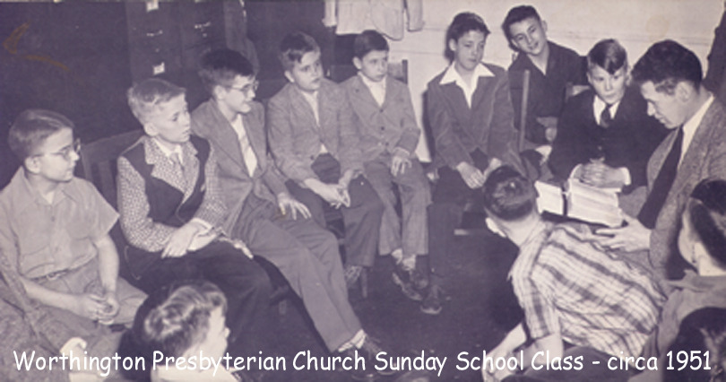 Children are pictured attending a Sunday School class at Worthington Presbyterian Church (773 High St.). Left to right are (?), Phil Horch, Jim Williams, Alan Fisher, (?), Tom Hindes, Jack Lutz, Joe Kelly, and (?).